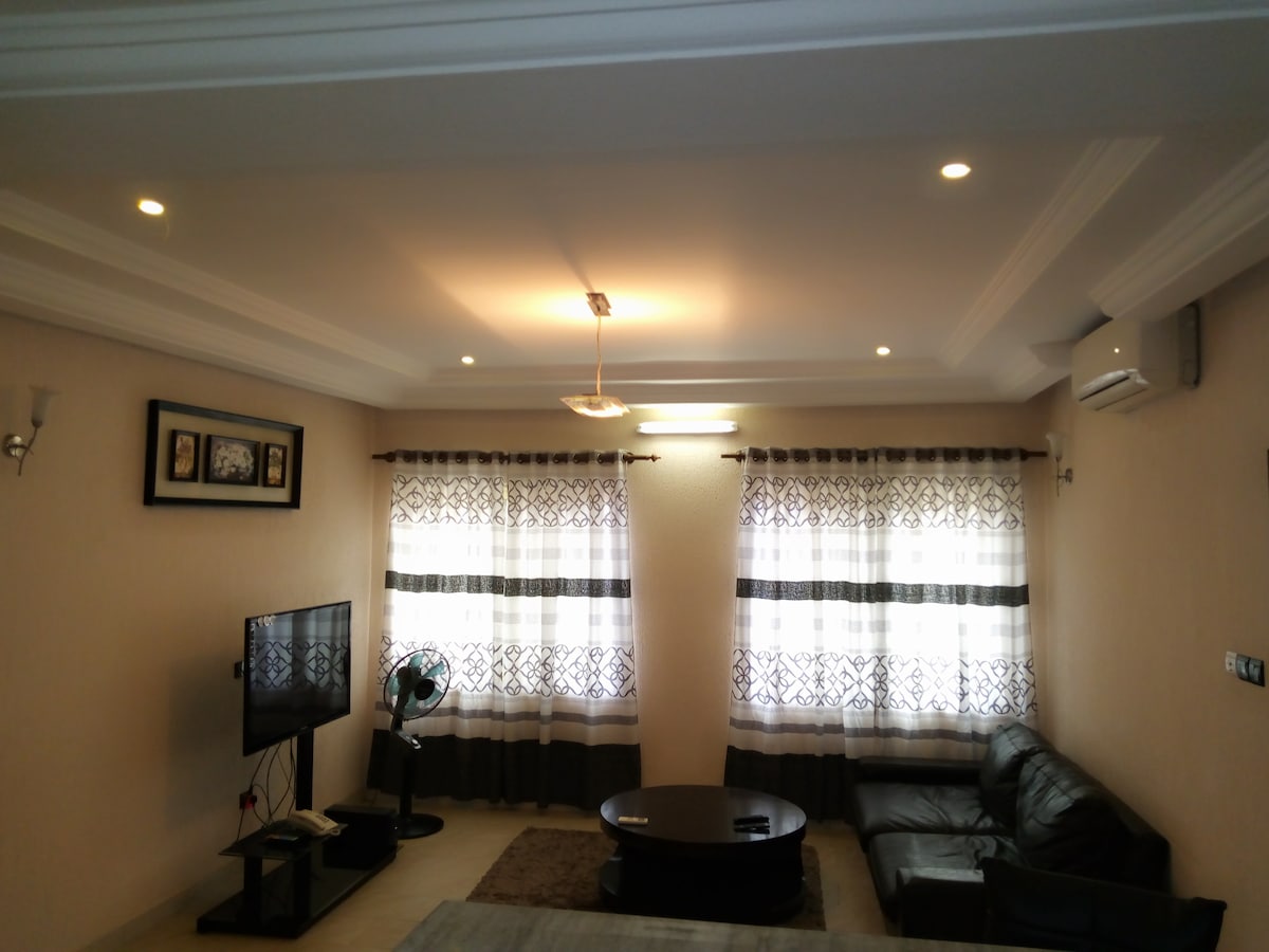 Appartement 2 chambres salon, une douche dans chaque chambre, une toilette visiteur, une cuisine. Il séduit par son approche de luxe business et vacances. Il est à Cotonou Akpakpa cinéma Concorde non loins du nouveau goudron, à 15 minutes de l'aéroport, à 5 minutes de la plage, à 5 minutes du grand marché de Tokpa. Détendez-vous dans ce logement climatisé, calme et élégant. Accès à internet 24h/24 Vous disposez d'un compteur personnel à carte qui peut être rechargé à votre convenance. Les frais