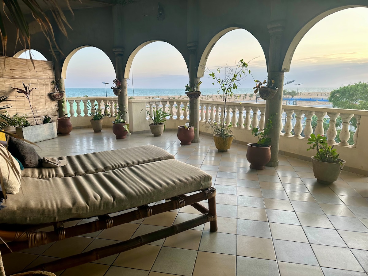 The flat, located in a quiet neighborhood on the "Route des Pêches" in FIDJROSSE, is decorated with unique African pieces, blending modernity and ancestral craftsmanship.