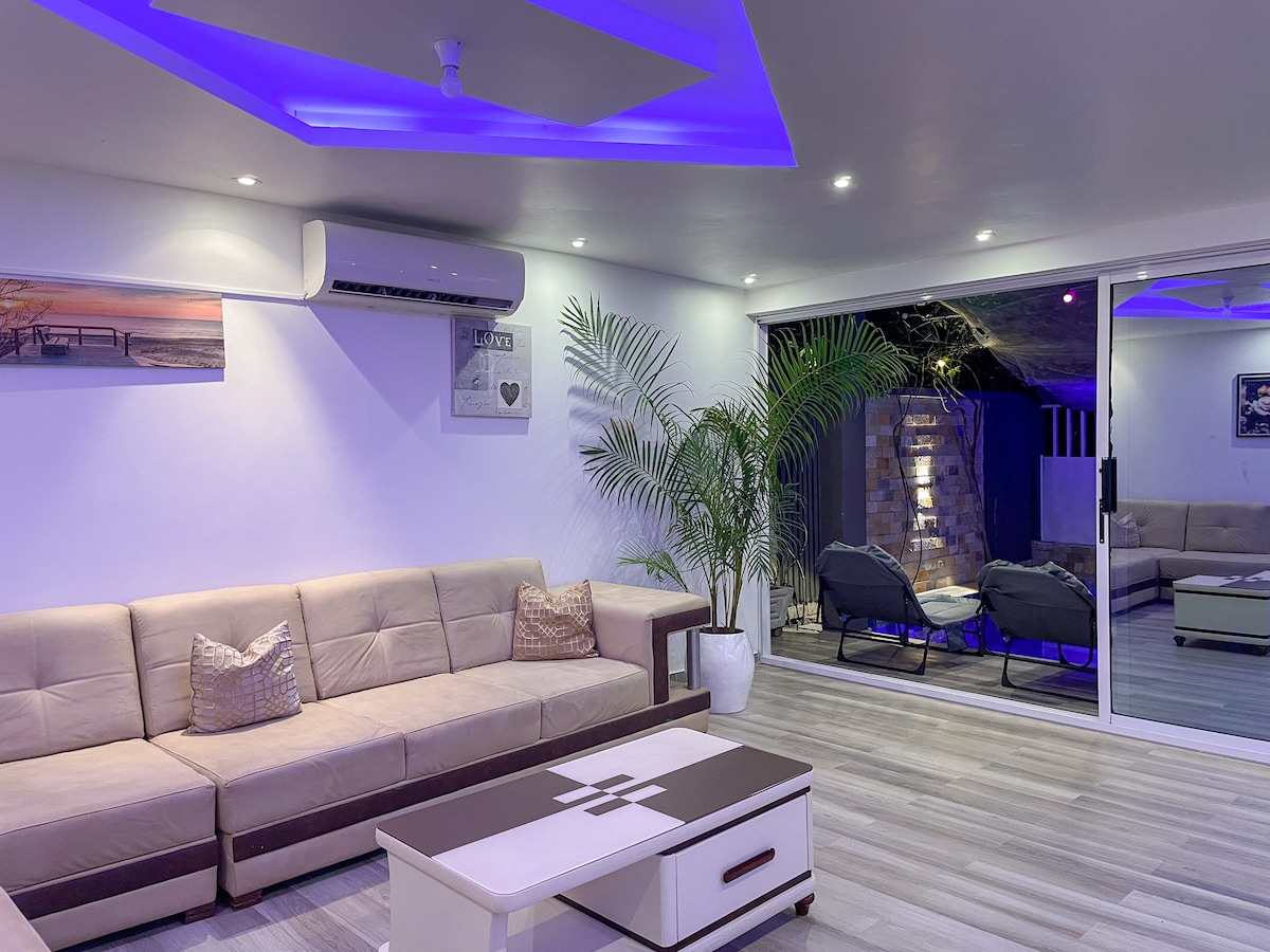 Ce logement allie design moderne et confort chaleureux. Son salon cosy avec canapé et coussins colorés invite à la détente, tandis que la cuisine ouverte, moderne et fonctionnelle, offre tout le nécessaire pour cuisiner facilement. L’élément phare est l’escalier design avec éclairage intégré, qui crée une ambiance unique et artistique. La grande plante verte et la télévision murale complètent ce cadre harmonieux, idéal pour un séjour agréable et mémorable.