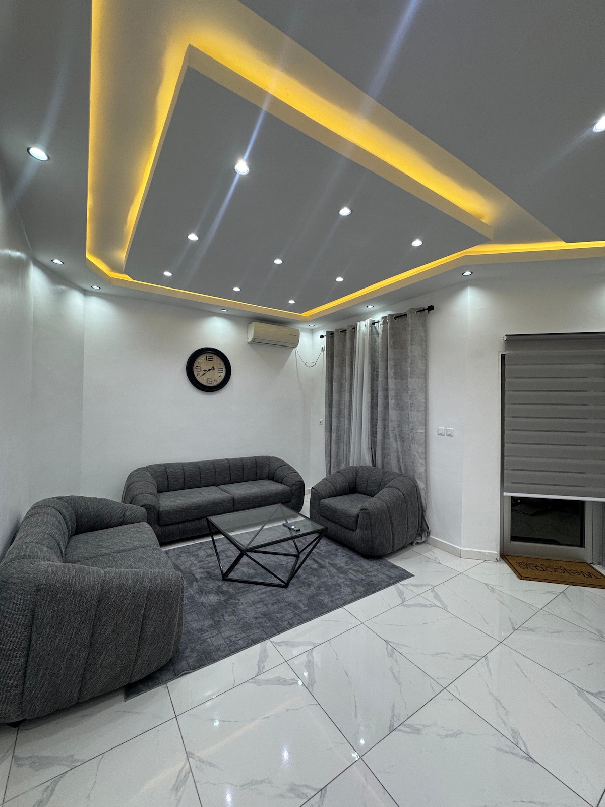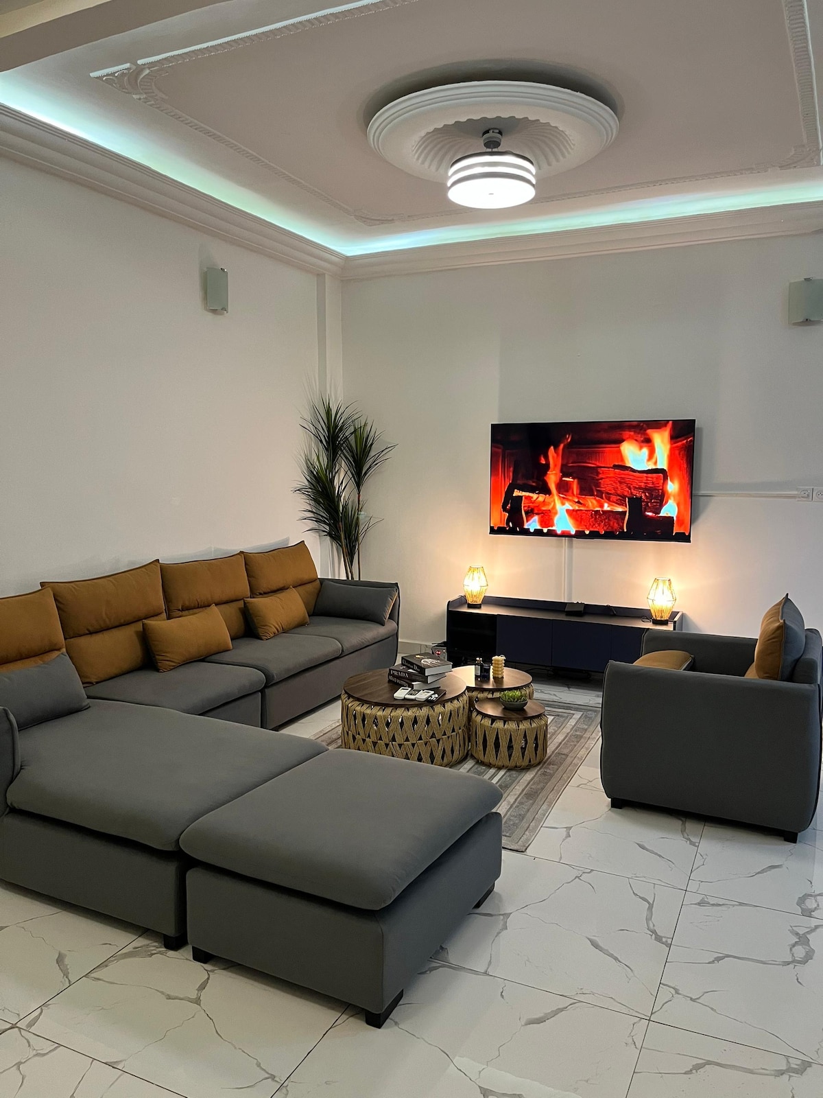 Appartement Haut standing Ambiance Led -Wifi / canal + -Grand Salon / Grande cuisine -Eau chaude -Smart TV 65 Pouces - 2 salles de bain -2 Chambres avec armoire -Climatisation salon et chambres -Service ménage -Groupe électrogène -Parking -Gardiennage, Camera surveillance -Terrasse