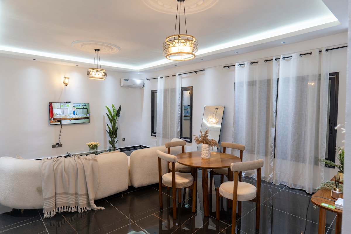 Relax and enjoy Douala in this quiet, elegant apartment: - Warm and elegant living room - Orthopedic mattress - Unlimited WiFi connection - Netflix and local channels - Hot water in all rooms - Fully equipped modern kitchen - 5 minutes from banks and supermarkets - Free on-site parking - 7/24 security guard - Maid service available - Air conditioning available throughout the house - Garden balcony with swing and city view - Prepaid meter for electricity