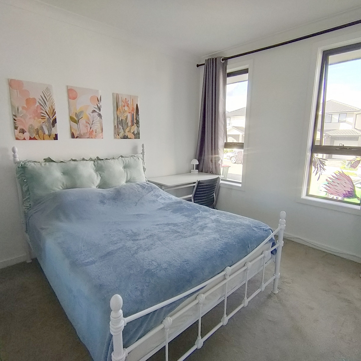 - Near new house on a safe, quiet lane - 10min walk to Woolies, diners, bus stop, etc.. - 4min drive to Coles, diners etc - Self check-in available. - Bedroom: lockable, height adjustable desk, chair, lamp, block out curtains, fan, heater, electric blanket, quilt, extra pillows and comforter, indoor socks etc.. - Separate bathroom and toilet are right beside this bedroom - King bed is approx. 183*203cm - $20/month unlimited data Felix mobile sim activation promo code "YW00840"