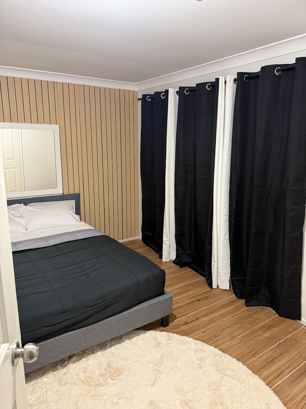 Entire house. Duct-air condition. 3 bedrooms are available with 2 queen beds and 1 king single bed. Main bedroom is locked empty. WiFi, towers, beddings, kitchenwares and toiletries are provided. 100 steps to swimming pool+spa, tennis court, BBQ. 1.5km to Glenfield railway station, shops are around. Long term rental welcomed.
