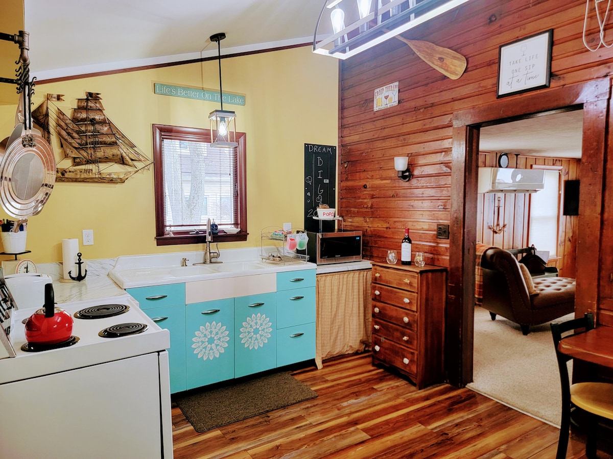 This cozy early 1900's 1-bedroom cottage is sure to create lasting memories on your vacation. It is perfect for a couple or small family. Come relax and cozy up by the gas fireplace while gazing at the stunning sunsets. It is waterfront, directly on Zukey Lake. 4 Kayaks & a paddleboat are available all year at no extra charge. At the end of the dock is a floating pontoon with a propane firepit that pairs great with your favorite beverage in the evenings. 20 min from Ann Arbor & Brighton.