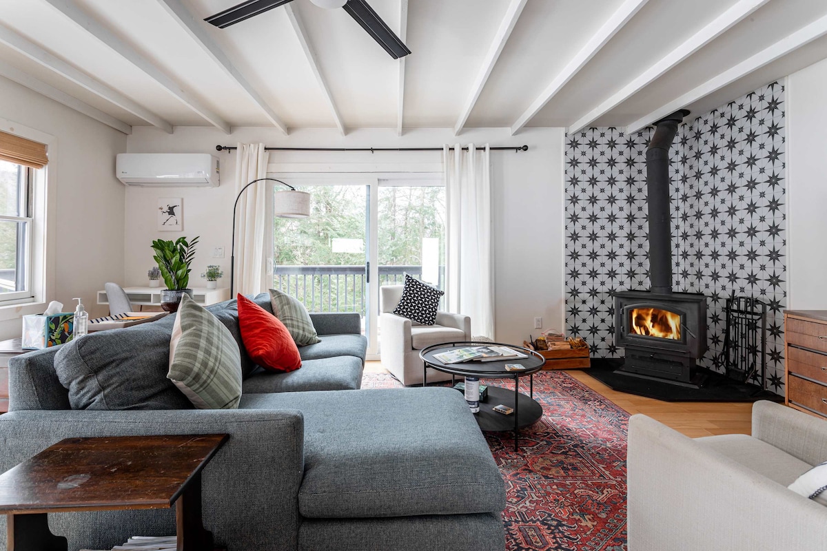 Remove the walls between you and nature in this spacious, vaulted and sun-drenched getaway. Nestled along a mountain stream on a quiet country road in the heart of the western Catskills, this fully redesigned house blends modern comforts with rustic styling, offering you and your guests an open invitation to kickback, “work from nature” or keep playing til sunrise. Under two hours from NYC, and less than 15 minutes from Livingston Manor, Cooley Mountain House keeps everything within reach.