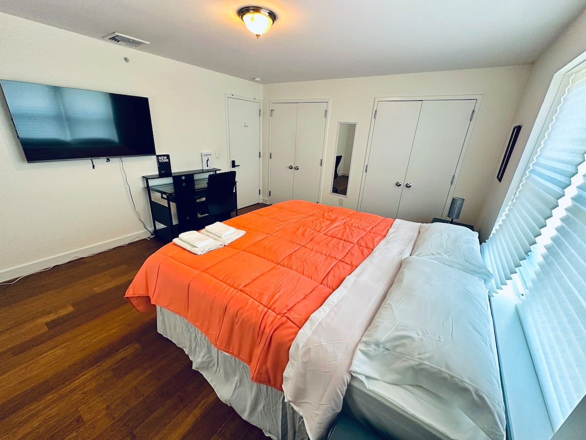 This meticulously curated Japandi-inspired studio is perfect for remote work or a peaceful retreat. The space features a cozy queen bed, small loveseat, and seating area. Enjoy high-speed internet, TV, and a writing desk for productivity. The suite includes a kitchenette with a fridge, microwave, and coffee maker. Located in a quiet, safe neighborhood, with access to a backyard fire pit for relaxation. Ideal for a calm, comfortable, and productive stay.