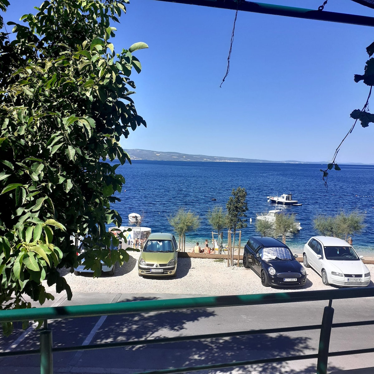 Apartman se nalazi na najboljoj poziciji u Omišu i ima otvoreni pogled na more. Potrebno je samo liftom spustiti se do izlaza i odmah ste nasuprot plaže koja je udaljena 20 metara. Apartman je u potpunosti renoviran 2024. godine. Na velikom balkonu s pogledom na plažu i more nalaze se udobne stolice i stol pa ćete se s užitkom provoditi svoje vrijeme uz miris mora. U blizini je restoran, pekarnica, caffe bar, trgovina. Do starog dijela grada je potrebno 5 minuta hoda.
