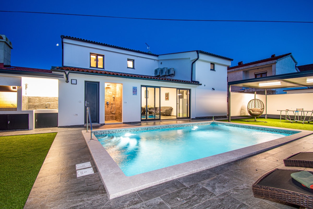 Villa Bella is a beautiful 5-bedroom villa located only 12 km from the city of Pula, and 800 m from the sea. Guests can enjoy a large 47 m2 pool, perfect for refreshing swims on sunny days, as well as a hot tub for ultimate relaxation. The outdoor area is ideal for sunbathing and gathering with friends and family.