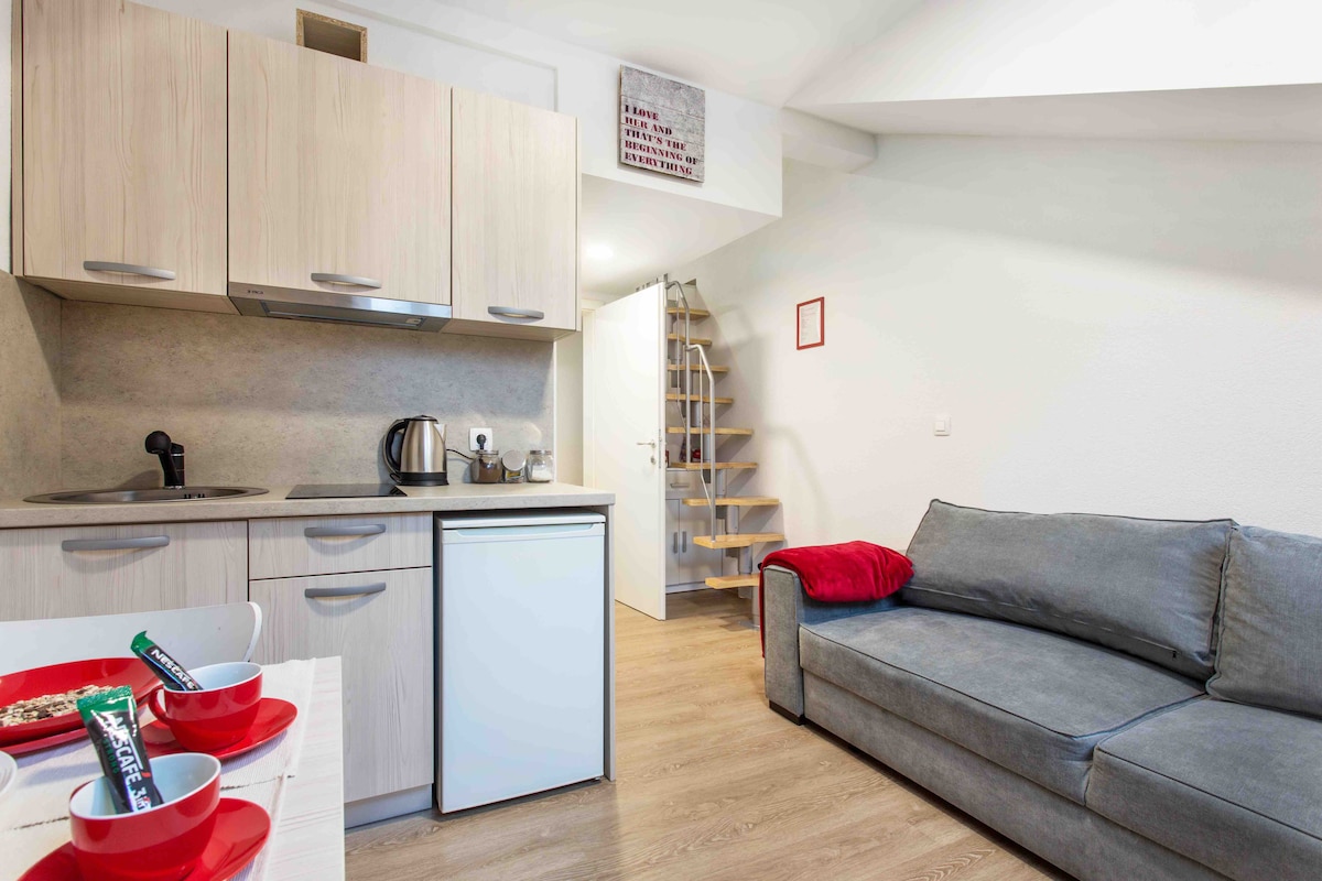 Located in the strict center of Ljubljana, the Sviti Studio Apartment in the famous Souvan House is the ideal starting point for exploring the city's sights. The air-conditioned apartment with high ceilings is located on the second floor and is accessible by lift. It has been recently renovated with a focus on modern design and comfort. The apartment is fully equipped for tourist as well as business stays, for shorter or longer periods and can accommodate 2 persons up to a maximum of 4 persons.