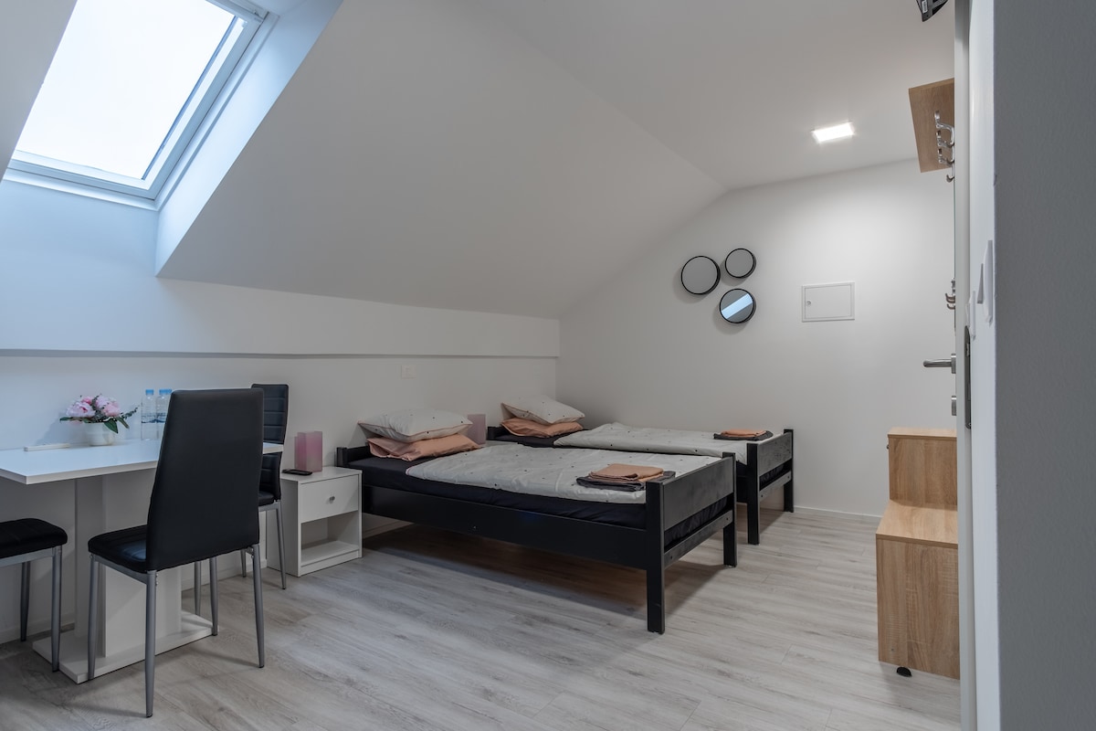 Newly renovated open loft with wooden beams and vibrant art, perfect for 5 guests + a baby crib. Stylish, clean design with all comforts: AC, TV, large kitchen, and washing machine. Ideally located for exploring Ljubljana’s center on foot, with easy access to train and bus stations nearby. Ideal for families or small groups seeking a unique, upscale stay with great convenience. Free breakfast (toast, jam, butter, biscuits, cereals, milk)