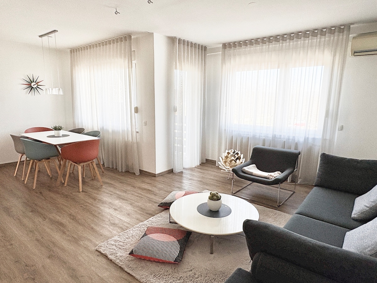 - luxury 115 square meter(m2) big apartment with the unique private balcony with the view on the Ljubljana castle in the centre of Ljubljana - furnished with designer furniture, Miele appliance for kitchen and bathroom - Two fully equipped bathrooms, one with the tub, one with the shower - 3 double beds, 2 air conditions - mini private gym: treadmill Nordictrack 2950 and weights - gaming: PLAYSTATION 5, toys for the kids included, Netflix, OLED tv 65" - city tax is 3,13€ on person per night