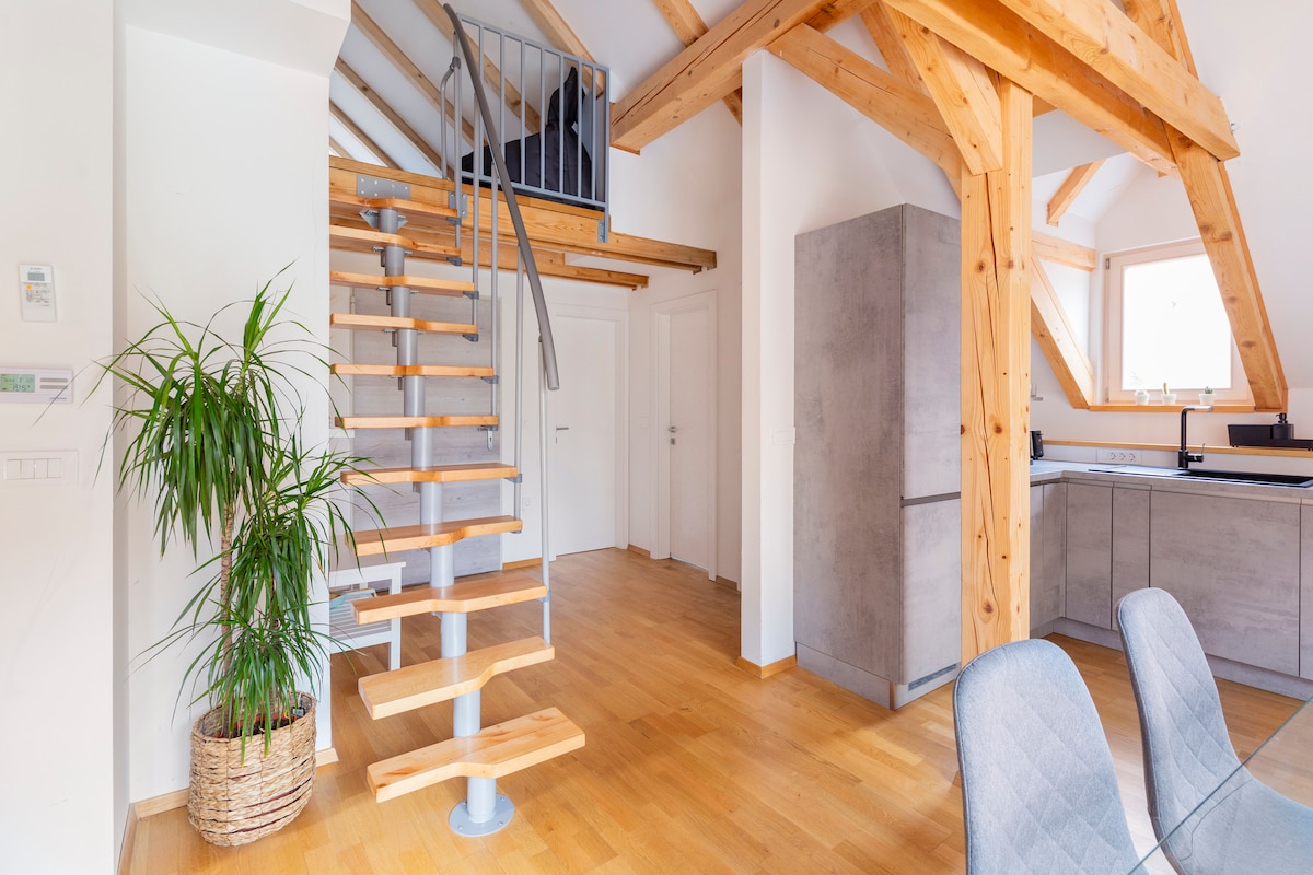 Our penthouse apartment, nestled beneath the iconic Ljubljana Castle, is a harmonious blend of history and modern luxury. This architectural gem is located within a cultural monument that offers an oasis in the city center, a quiet area, with stylish furnishings where history and modernity harmoniously coexist. You're just steps away from major attractions (marketplace, Funicular, Dragon Bridge...main bus&train station). Best location in town, at the crossroads of Ljubljana's cultural tapestry.