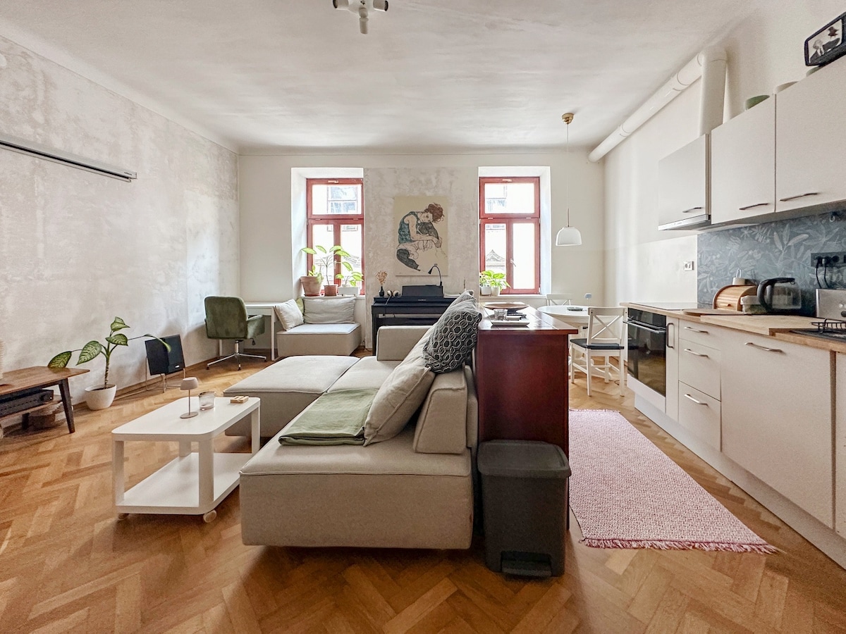 This spacious, immaculate and cozy apartment will be your oasis in the very heart of the city. Unbeatable quiet location with walking distance to the Triple & Dragon Bridge and the Central Market. Surrounded by many amazing restaurants, cafes, bbq & bars. Only a few minutes from the main train & bus station. Comfortable queen (160cm) bed and attached bathroom with a shower. A fully equipped kitchen with a refrigerator. Linens, towels, toiletries and a washing machine provide. Free garage