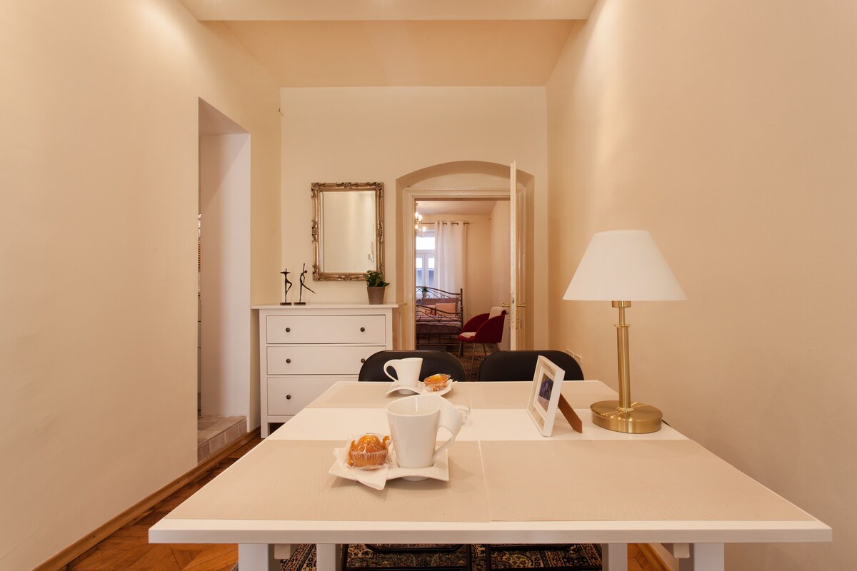 This immaculate and spacious apartment will be your oasis in the heart of the city overlooking the castle Unbeatable location inside the quiet pedestrian zone with walking distance to the Triple & Dragon Bridge and the Central Market. Surrounded by many amazing restaurants, cafes, bbq & bars Comfortable queen (160cm) bed and attached bathroom with a shower and a tub. A smart 40" TV, fully equipped kitchen refrigerator, as well as seating area. Linens, towels, toiletries, washer&dryer provided