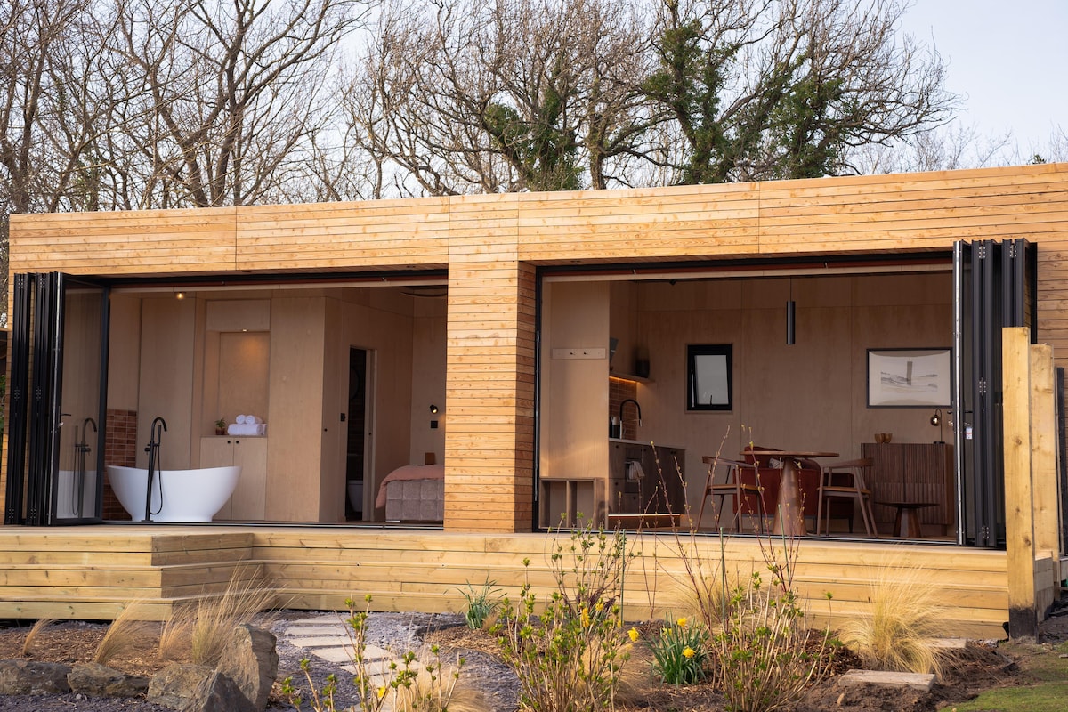 A beautifully designed modern cabin for two, set in its own private space on our smallholding near Newborough, Anglesey. Warm birch ply interiors, oak floors, a luxurious super king bed, spa-like freestanding bath with a view, and big south-facing windows create a calm, contemporary retreat. Close to forest, beach and coastal walks, it’s a peaceful place to switch off, explore and slow down.