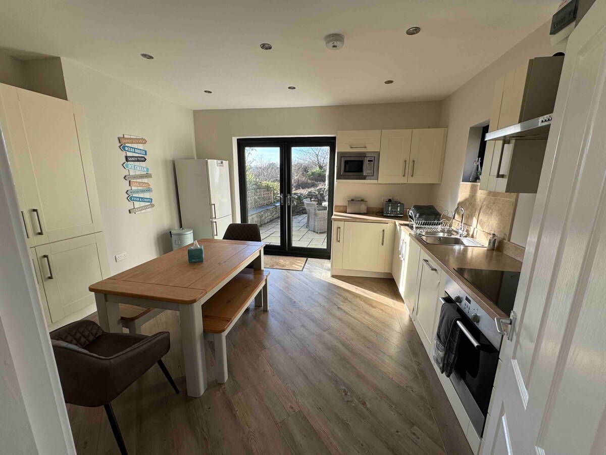Brynmôr Bach is a light and airy, recently refurbished, semi-basement garden flat. Open plan design kitchen/dining/living area. Double bedroom & bunk bedroom. Lovely garden with mediterranean style courtyards, summerhouse and rural views. Travel cot & high chair available. Off road parking. 5-10 mins walk to pubs, restaurants, shops and beaches. Why not book 1 Brynmôr, the three bedroomed house above which sleeps 9 & hot tub, to extend accommodation for larger groups at the same location?