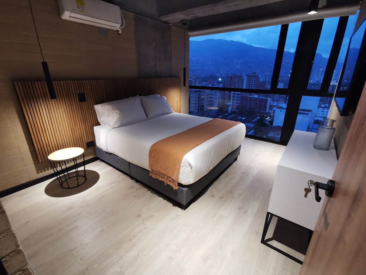 RECENTLY RENOVATED -High-speed internet great for remote work -Brand new A/C -Fully renovated Industrial design apartment -King size bed -Breathtaking views of Medellín (trust me, worthwhile to stay here) -19th floor -Unbeatable location in Poblado near to Provenza and Lleras Park -Modern amenities -Spacious living area -Smart TV x 2 -Fully equipped kitchen -Washer & Dryer Tower -Pool -Gym -Coworking space -Restaurant inside the building -Private parking -Self check-in -24/7 Security
