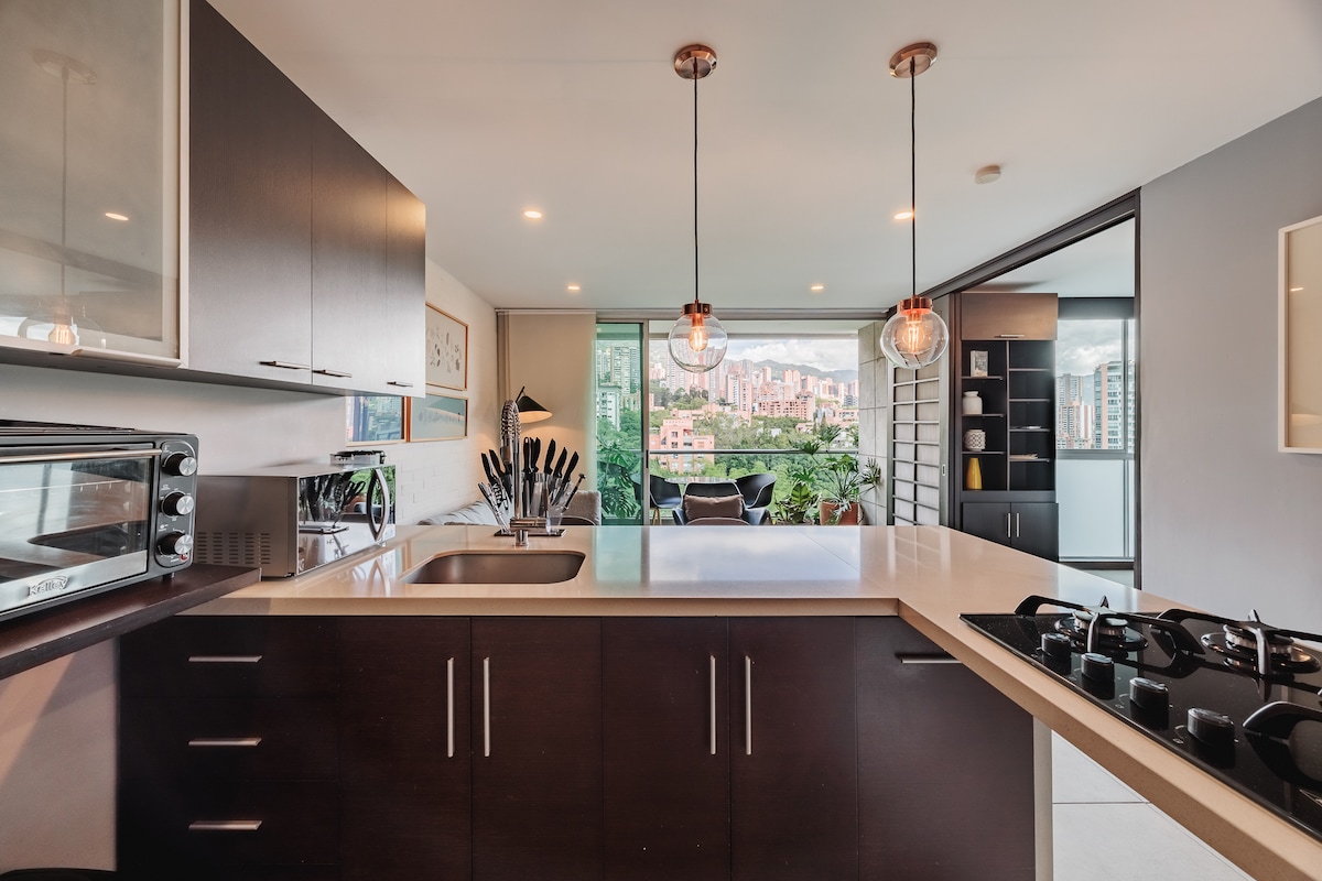 Brand new building (Hotel Urban Studios) & luxury apartment located in the best sector of El Poblado (El Tesoro), is perfect if you are looking for a peaceful and beautiful space. - Luxury interior design, furnishings - Spectacular views from Living Room, Bedroom, & Office - Full Washer & Dryer - Air conditioner In the Bedroom - 55¨Smart TVs LG - 200GB+ Wifi - Heated Pool & Jacuzzi - Steam Room - Complete modern gym - 24-hour security