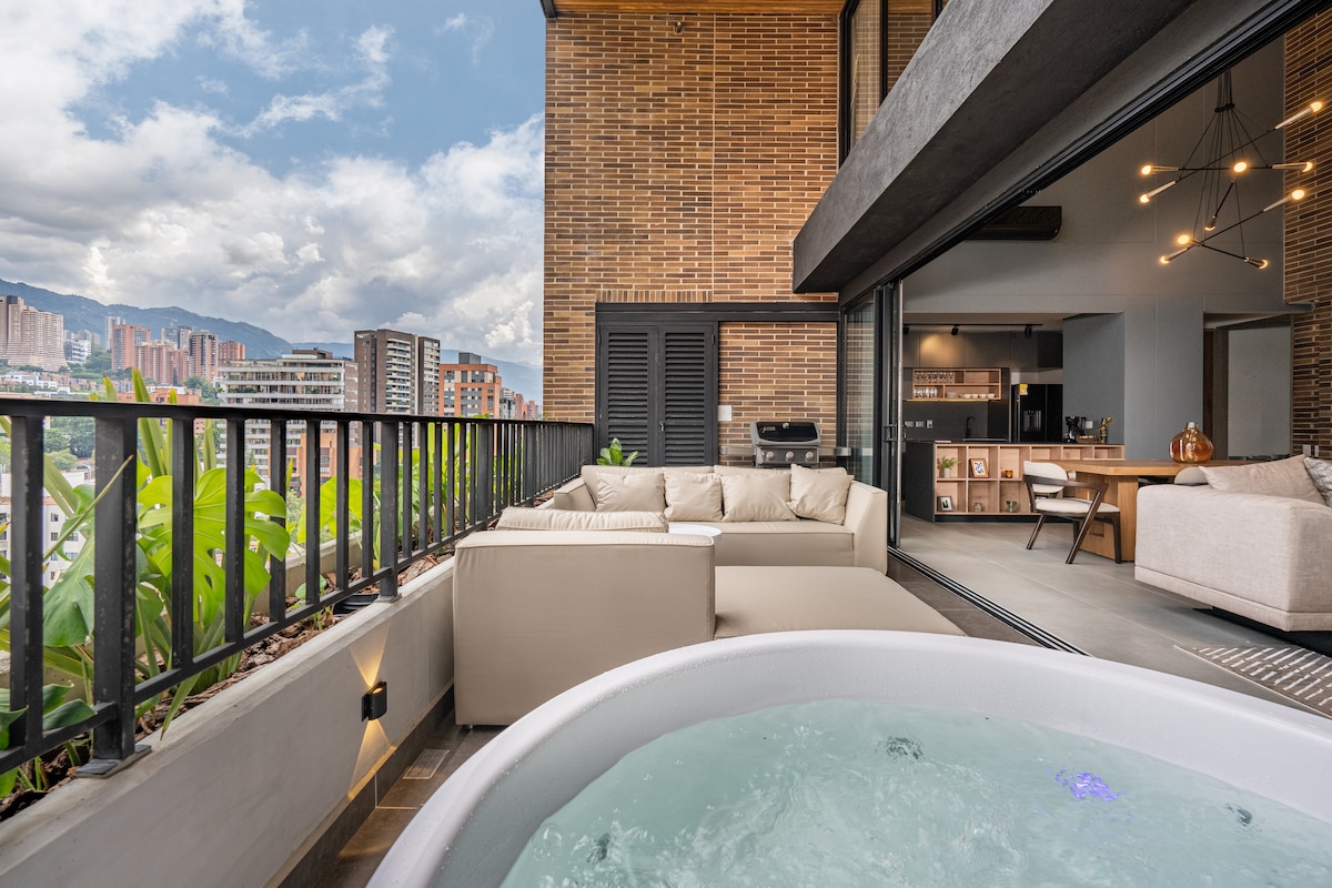 Premium 21st-floor El Poblado apartment with private jacuzzi, panoramic skyline & mountain views. Relax on your balcony, stay comfortable with A/C, work with high-speed Wi-Fi and dedicated workspace, and enjoy 3 HD TVs with Netflix, fully equipped kitchen, washer/dryer, and tea/coffee station. Access spa, gym, steam room, pool, restaurant & cafeteria. Short drive to Parques Lleras & Provenza — the ultimate high-rise retreat for luxury, style, and comfort.