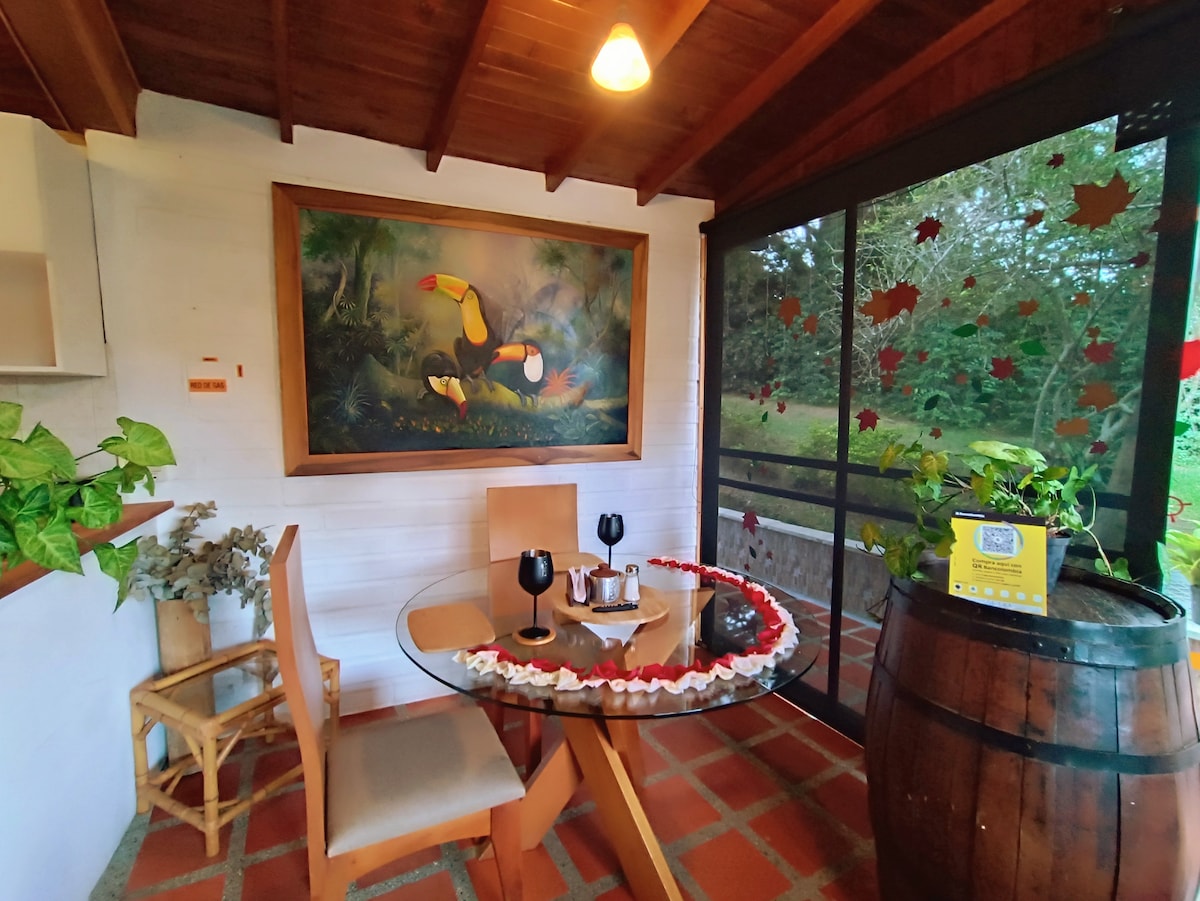 Es una cabaña de madera rodeada de árboles, animales y arroyos que hacen que tu estadía sea tranquila, placentera e inolvidable. El lugar perfecto para unos días de descanso en familia, en pareja o con amigos, apreciando hermosos amaneceres y atardeceres Exclusivamente para nuestros visitantes, alejada del bullicio de la ciudad, totalmente independiente y privada sin vecinos a tu alrededor, tendrás la visita de los maravillosos animales como el barranquero, ardillas, tucanes y otras aves.