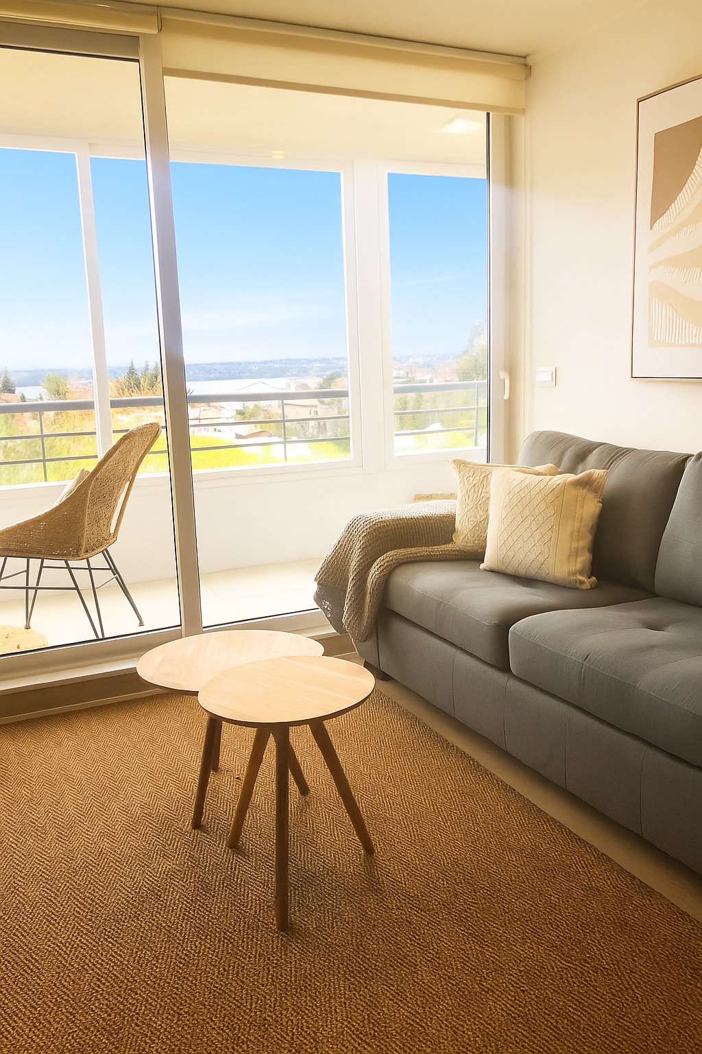 Departamento full equipado para 4 personas, ubicado en edificio nuevo, frente al Lago Llanquihue y a pasos de distintos restaurantes. El departamento incluye todo lo necesario para una grata estadía, considerando 1 cama tamaño King y 2 camas individuales (cama nido). El departamento cuenta con estacionamiento privado, ubicado en el subterráneo del mismo edificio. El edificio cuenta con lavandería, jardín privado y una amplia piscina temperada, disponible para los huéspedes del departamento.