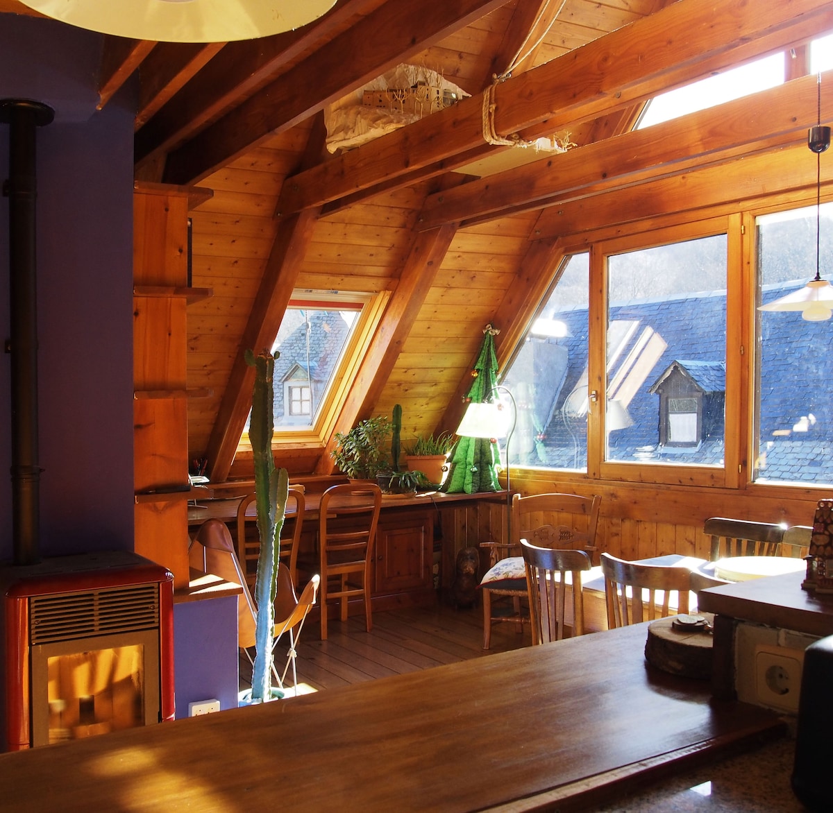 El espacio que se alquila es la buhardilla de una casa del casco antiguo de Arties, justo al lado de la iglesia de Santa Maria. Al apartamento se accede por el interior de la casa y consta de dos plantas, en la primera hay un espacio amplio que contiene Sala de Estar, Comedor y cocina y además una habitación doble con baño completo. En la planta alta hay un baño y dos habitaciones, una con cama doble y otra con tres camas. El apartamento está equipado con todo lo necesario para entrar a vivir.