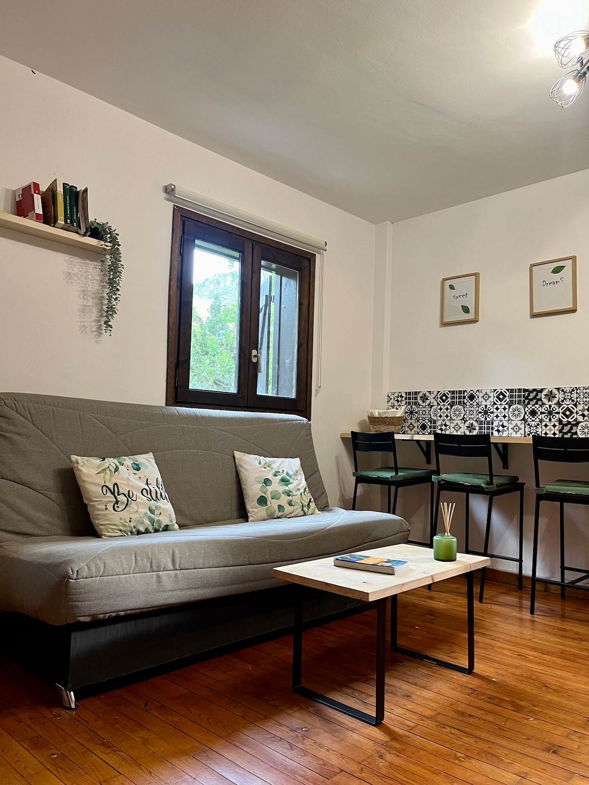 Private studio with fully equipped kitchen, sofa (with double folding bed), TV and bathroom. It also has a balcony overlooking the countryside with an outdoor table and chairs. During the summer, you will have free access to the municipal swimming pool. The accommodation has heating or air conditioning that can be adjusted to your liking, free Wi-Fi internet. The price includes bed linen and towels.