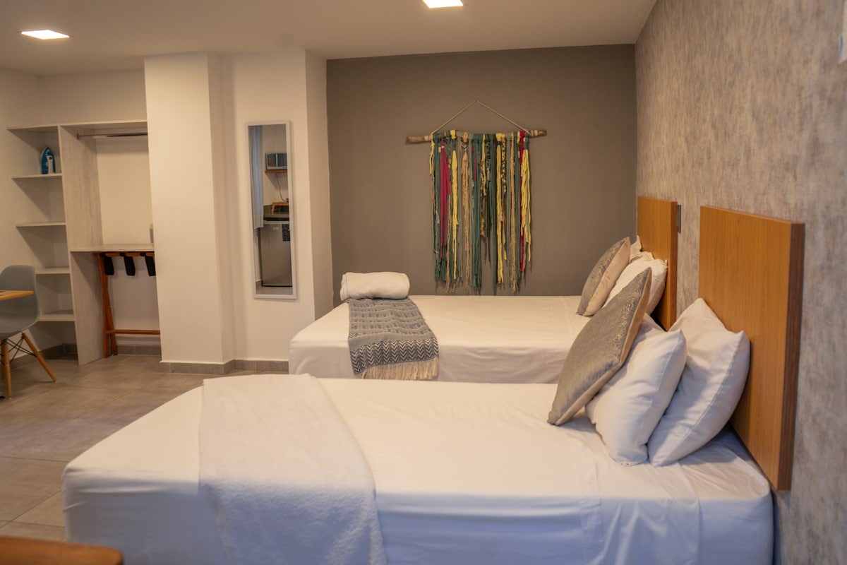 This place is not to be missed. We have 1 bedroom 1 bathroom with a jacuzzi. A fully equipped open kitchen concept. High Ceilings. modern light decor and a 55'' HD TV. This hotel is perfectly located within 2 blocks of Parque Lleras. Within a few mins walk from the best Restaurants in Medellin like Carmen, El Cielo and Hanami. If you want to be in the heart of the action where the locals hang out this is the place to be. Everything you need is at a few steps reach.