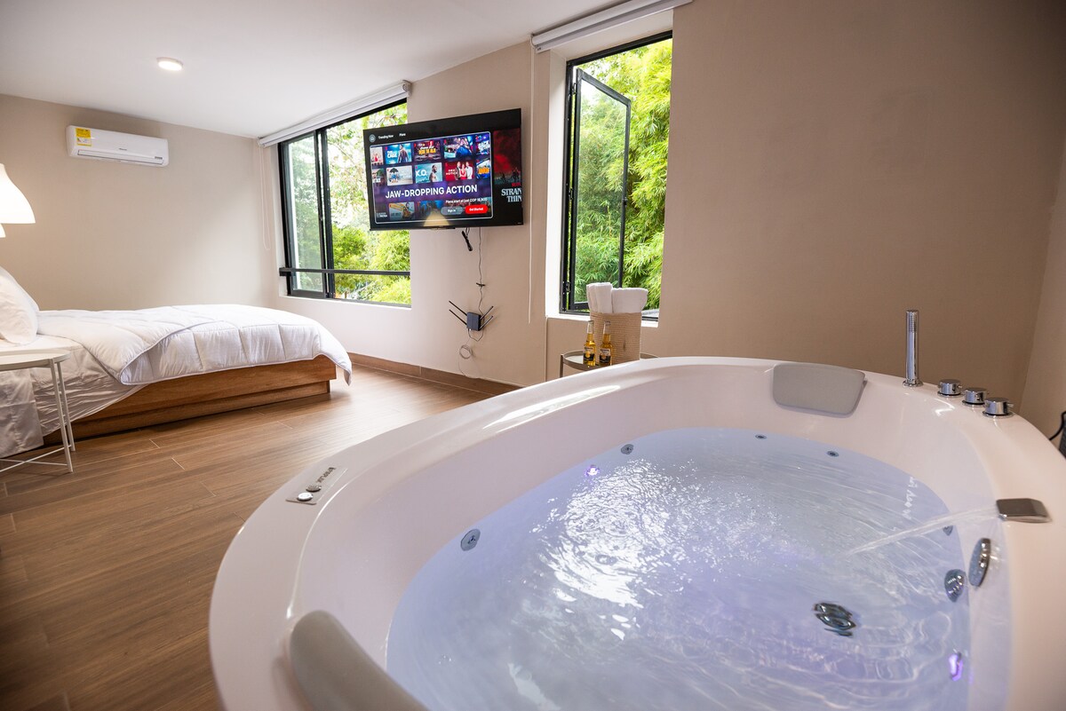 Great pool on building´s terrace Jacuzzi, Steam and Gym Balcony with Priv. Jacuzzi /Queen size bed AC Separate Bedroom-Living Room Restaurant/Bar Lounge in lobby. Room service Comfort and spacious in contemporary design. Complete kitchen Great view of city and mountains. Close to Provenza best bars/restaurants in city. Clothes washer and gas dryer in apartment. Energy Living iconic building in Medellin Private jacuzzi in Balcony 11th Floor 1.000 Sq. Feet Fast Wifi 24/7 check-in