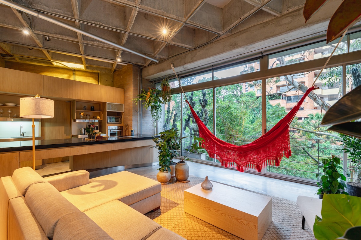 • Amazing location in heart of Poblado: "Oasis in the middle of the best part of the city, walking distance to everything” • Modern, fully furnished Loft • High speed 100 Mb WiFi • Loads of nature around • On-site staff to help you with your needs 24/7 • Air Conditioner • Pool + Hot Tub in the common areas • 5 mins walk to best restaurants, cafes, malls. 15 mins walk to Poblado and Lleras Park • Fully stocked kitchen with appliances • 43” Smart TV with Apps • Transparent prices