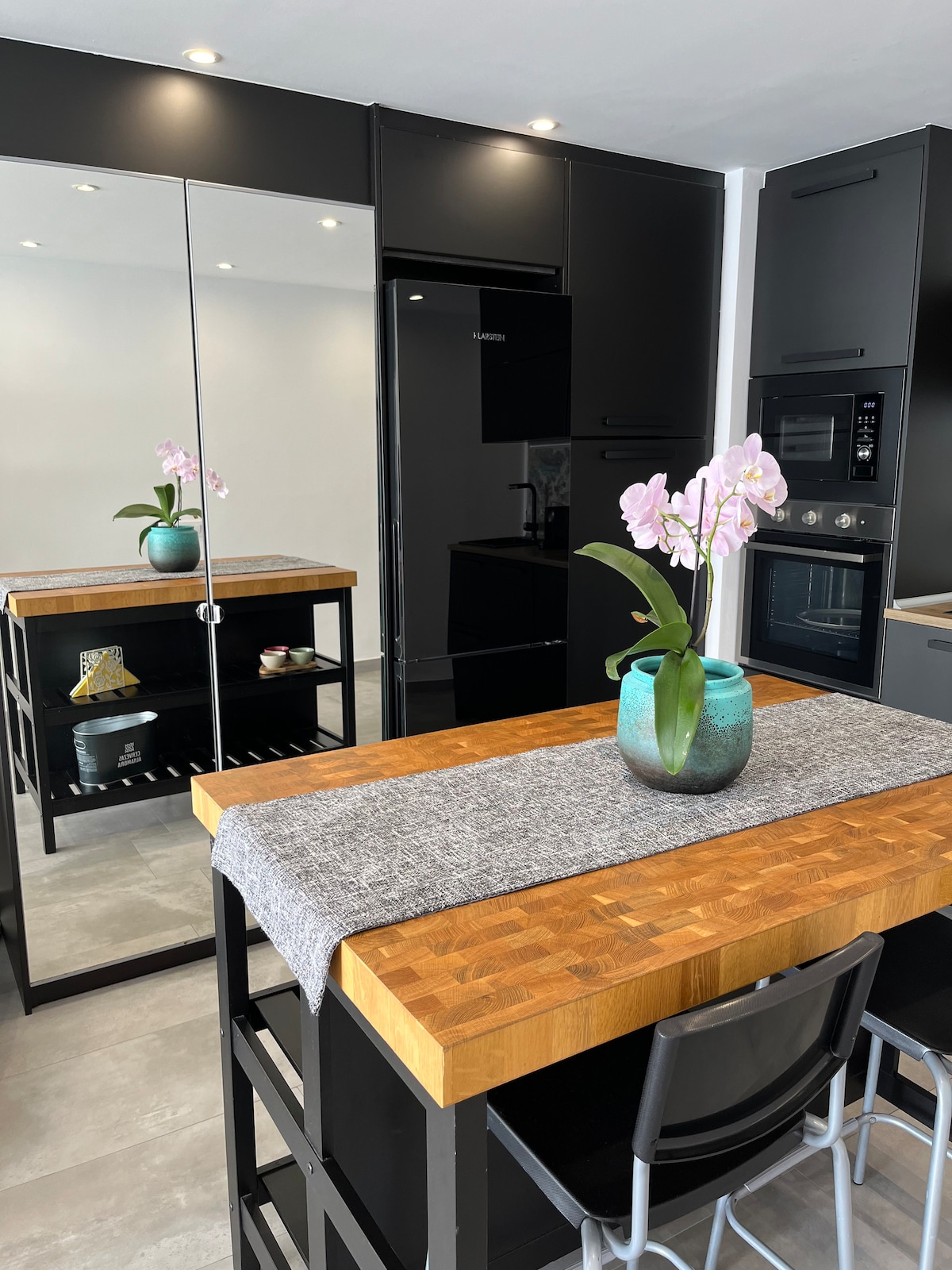 El apartamento es muy amplio con dos habitaciones con mucha luz , cocina independiente con nevera, horno , fogones de vitrocerámica, microondas, lavadora, lavaplatos etc. lavabo con bañera grande y comedor con amplia terraza. A 50 metros de la playa ,cerca de supermercados, bares, restaurantes Zona muy tranquila pero con todos los servicios cerca