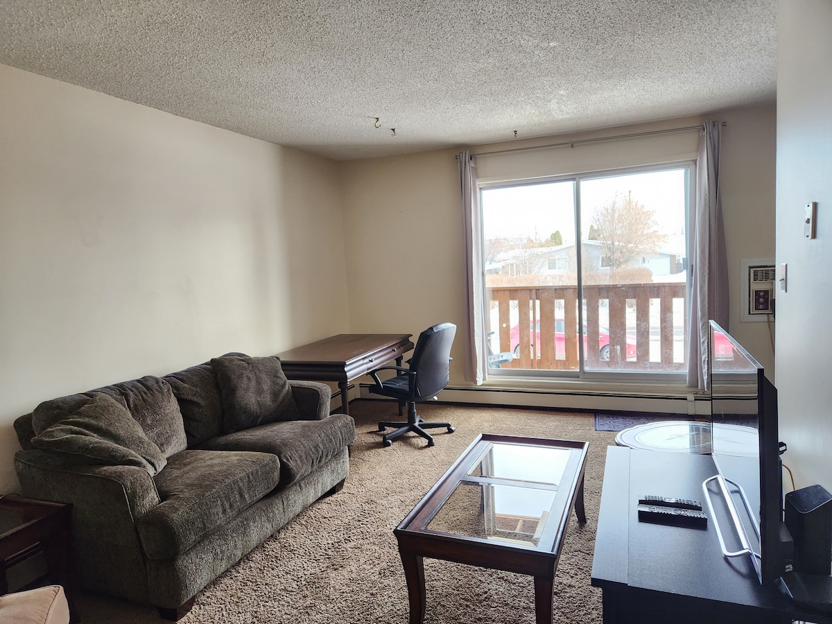 Enjoy a comfortable stay at this centrally located suite. This private and fully loaded apartment is designed to make you feel at home with the convenience that has everything you need to live and work comfortably during your stay in Lloydminster It is a ground floor walk in unit with Queen bed, Double Bed, Highspeed Wifi, Full Cable Package, Power Reclining Love Seat, Lounge Chair, Dining table/chairs and a fully stocked kitchen with Keurig, microwave, toaster, pots, pans, and dishes.