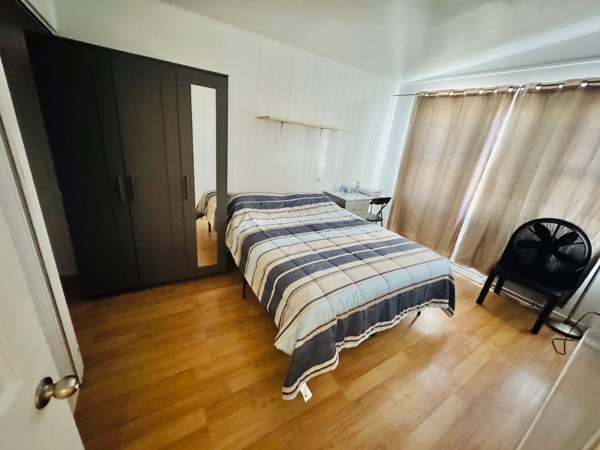 Take it easy at this unique and tranquil getaway. In a quiet neighborhood. Your own home away from home. With private deck and parking, close to all amenities: upgrader, ball diamonds, shopping, etc., this will fit perfect into your stay plans. Your private home boasts a king size bed, WIC, 3-piece bathroom, updated kitchen, living room with wifi for your electronics, and a laundry room. Private deck and BBQ complete the package. On same property as host.