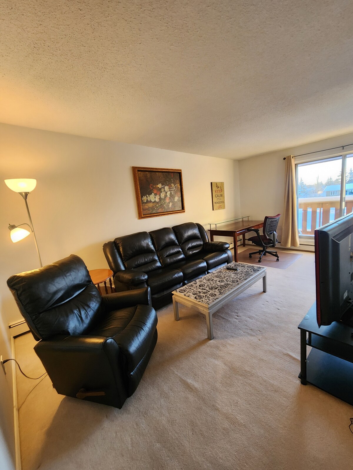 This second floor balcony 2 bedroom unit has everything you need to live and work comfortably during your stay in Lloydminster. The building is across the street from Co-op Marketplace. It has a queen bed in both bedrooms, with bedding and towels included. It includes Telus High Speed Wifi and Full Cable Package with TV, Comfortable Love Seat and Recliner, dining table/chairs, and a fully stocked kitchen with Dishwasher, Keurig, Microwave, Toaster, Pots, Pans, Cutlery, Utensils and Dishes.