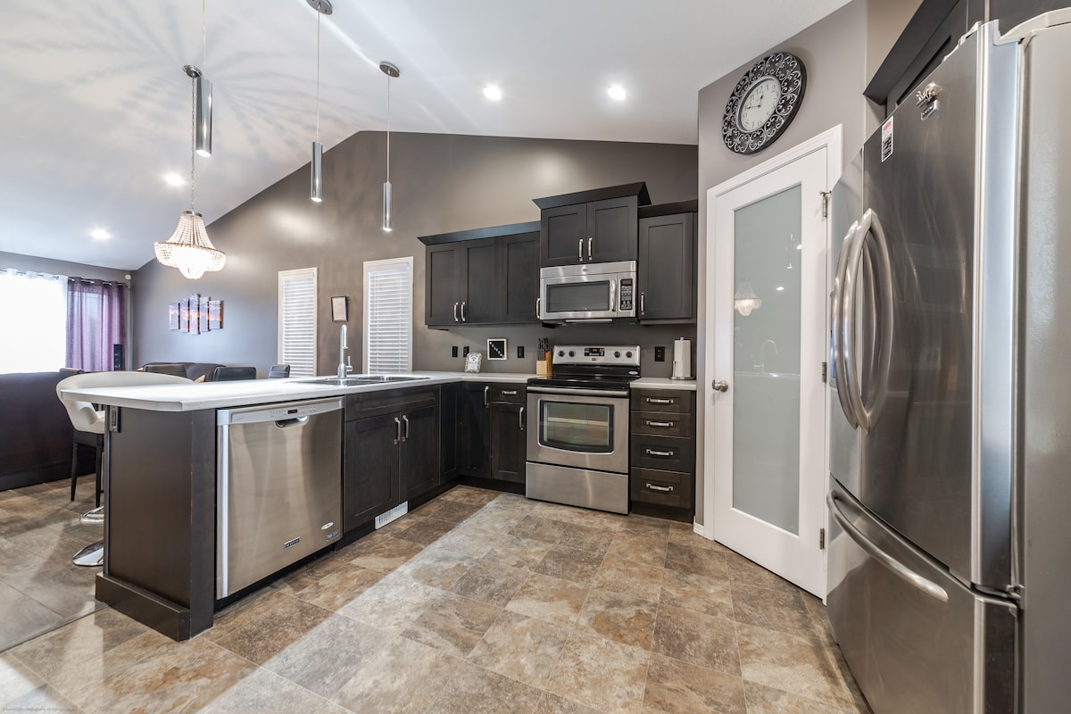 The whole group will be comfortable in this spacious and unique space. Perfect for large family getaways, or long work stays, this townhouse is packed with all the amenities you need: bunk beds, large living area, fully stocked coffee bar, large kitchen table, complimentary toiletries, quiet neighbourhood yet, and 2 free upfront parking stalls with spacious street parking. Bring the whole family to this great place with lots of room for fun.