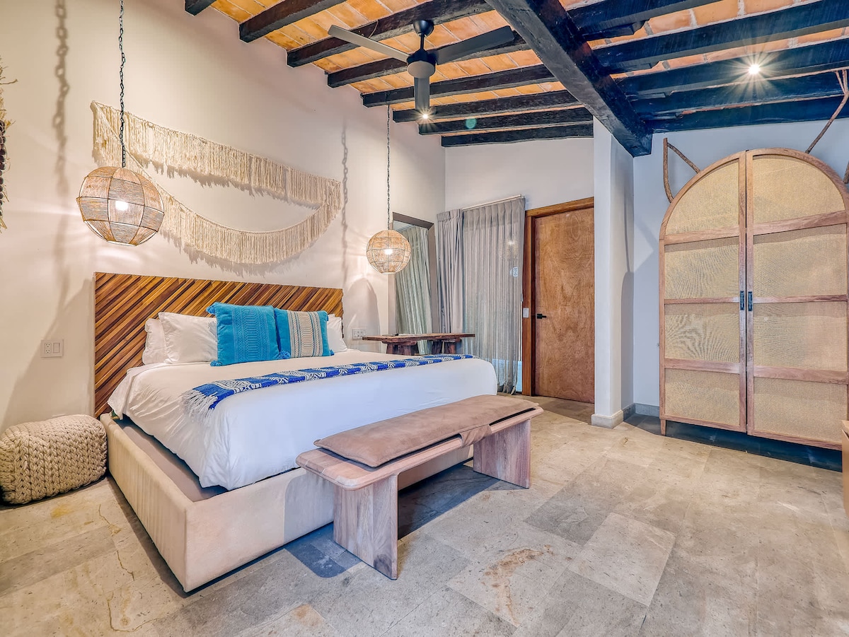This stylish and unique penthouse sets the stage for a unforgettable trip. Villa Cobojo #7 is a part of a 7-unit boutique hotel called Villa Cobojo (formerly Casa de la Reyna). The Palapa Penthouse provides boho beach charm for a romantic retreat on the breathtaking Rivera Nayarit. #7 comes with a complete and modern kitchen with grill, an open plan terrace living/dining room and a romantic bedroom with an unbelievable sunset view.