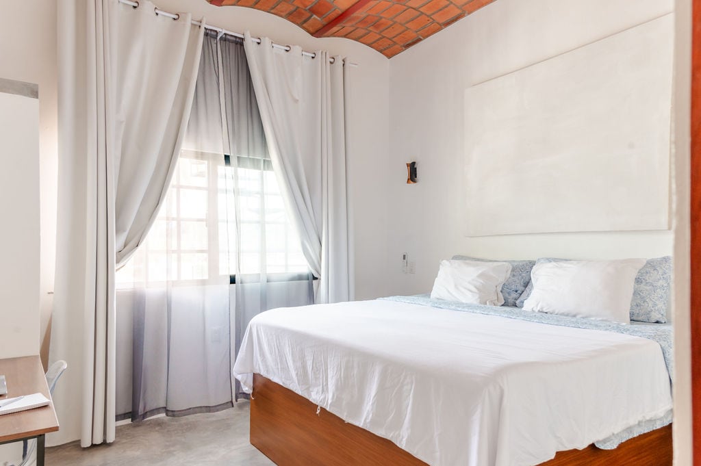 Welcome to Soleil Surf Shacks! Escape to Lo de Marcos and enjoy this airy, modern suite with a comfy king-sized bed, smart TV, air conditioning, and sleek concrete finishes. Large glass doors open to a private covered patio, complete with a seating area and a tucked-away outdoor kitchen—perfect for relaxing or enjoying a quiet meal. A vibrant, cozy space just a few blocks from the beach and town plaza.