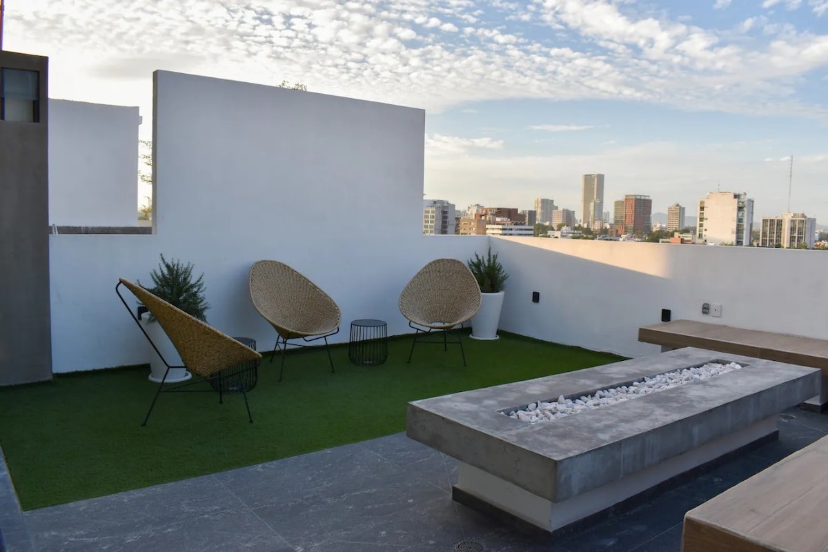 Departamento elegante y céntrico que ofrece un espacio único y cómodo para los viajeros que buscan una inolvidable estadía. El depa se encuentra en el corazón de Guadalajara, zona chapultepec/americana, ofreciendo un fácil acceso a las atracciones más populares de la ciudad, incluidos lugares de interés histórico, la mejor zona gastronómica y cultural (cafeterías, mercados, bares, etc). Disfrutarás de una vista de 360° desde nuestra terraza rooftop. Contamos con 2 terrazas, alberca y firepit.
