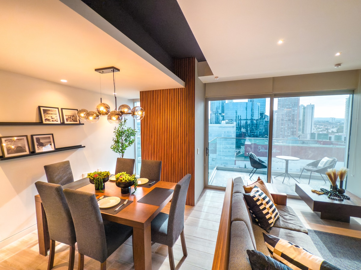 Lujoso departamento en Guadalajara, decorado por el despacho FNisino y con muebles fabricados a la medida por manos tapatías. Hospédate en uno de los edificios más exclusivos y nuevos de Providencia, cerca de la zona financiera, el Bosque Colomos, Punto Sao Paulo y solo a 10 minutos de Andares. Espacio excepcionalmente cómodo, que cuenta con todos los servicios y que te hará pasar una increíble estancia. Cuenta con seguridad 24/7, alberca, gimnasio, coworking y estacionamiento propio.