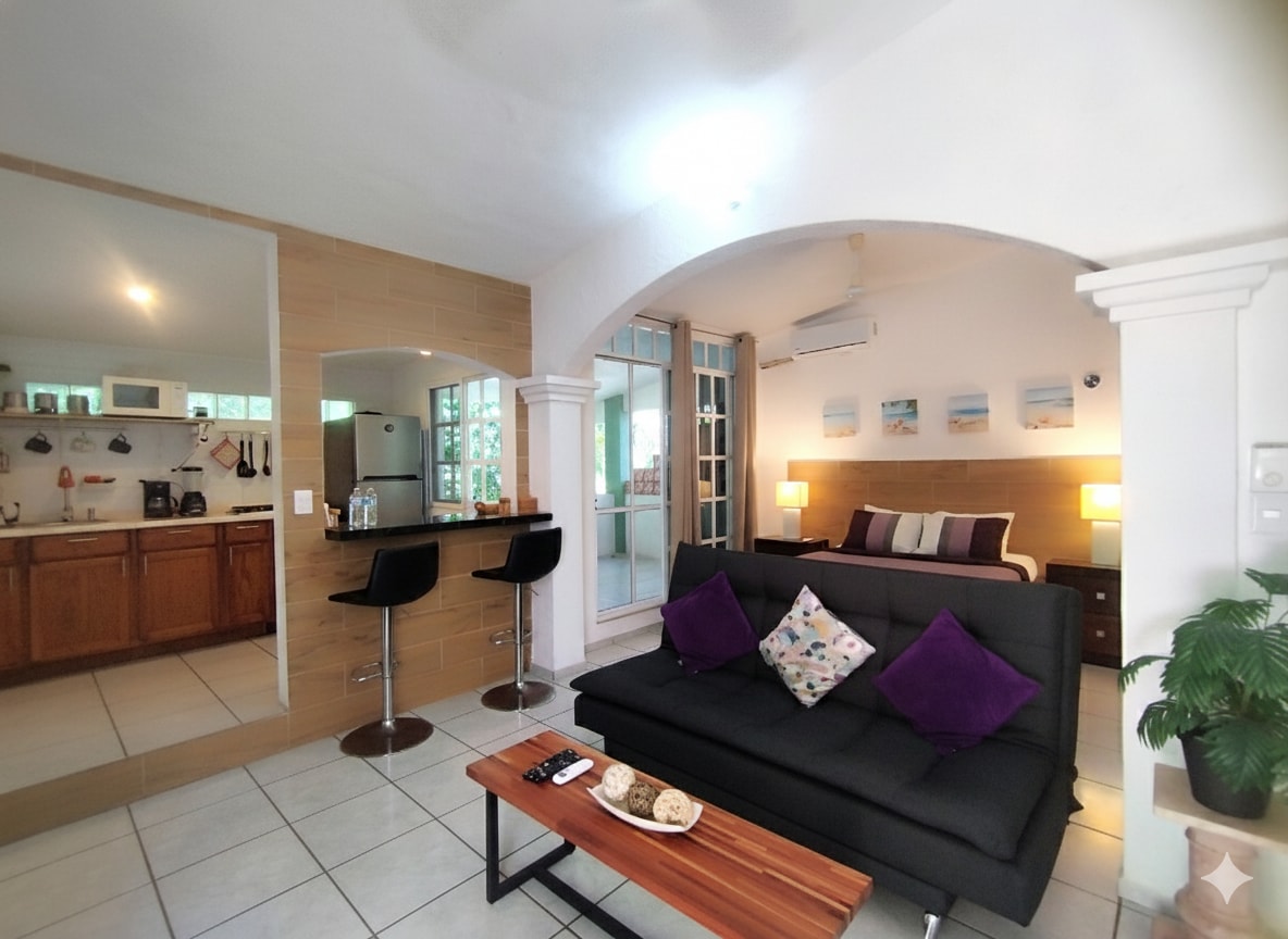 Desconecta de tus preocupaciones en este espacio tan acogedor y sereno, pero excelente para trabajo. A 0.25 millas del mar, cerca de un supermercado, estacionamiento propio, cámaras de seguridad, wi-fi, aire acondicionado, tv en sala y habitación, cocina equipada, closet, baño propio, Cerca de lugares atractivos para visitar.