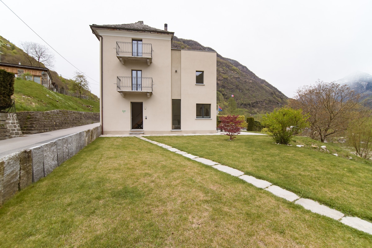 Apartment on the ground floor suitable for 2 adults + 1 extra guest. Spacious and bright, comfortable and cosy furnishings. Beautiful view of the mountains and the landscape. Possibility to rent the apartment above (Casa Lele - Sole). Big dining terrace in shared use. Bus stops “Rovana” (n.331) 180m; “Cevio Centro” (n.315) 650m. Supermarket, Kiosk, Restaurants ca. 1km. 27km from Locarno. Bosco Gurin ski area 16km. Wonderful clear water baths, hiking paths and waterfalls in the surroundings.
