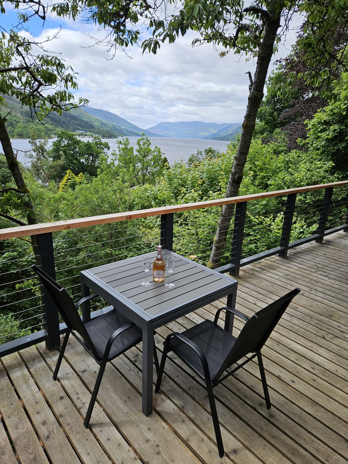 Cois Loch Lodge is a unique lodge situated in a peaceful setting with magnificent views over Loch Lomond and the hills beyond. Nestled at the end of a private road between Drymen and Balmaha, it has its own private parking and enclosed garden. French doors open out onto a fabulous decking area furnished with a table and garden sofas. A few steps down from the deck sits a tastefully furnished Scandinavian BBQ hut. No matter the weather, you can still enjoy a BBQ!