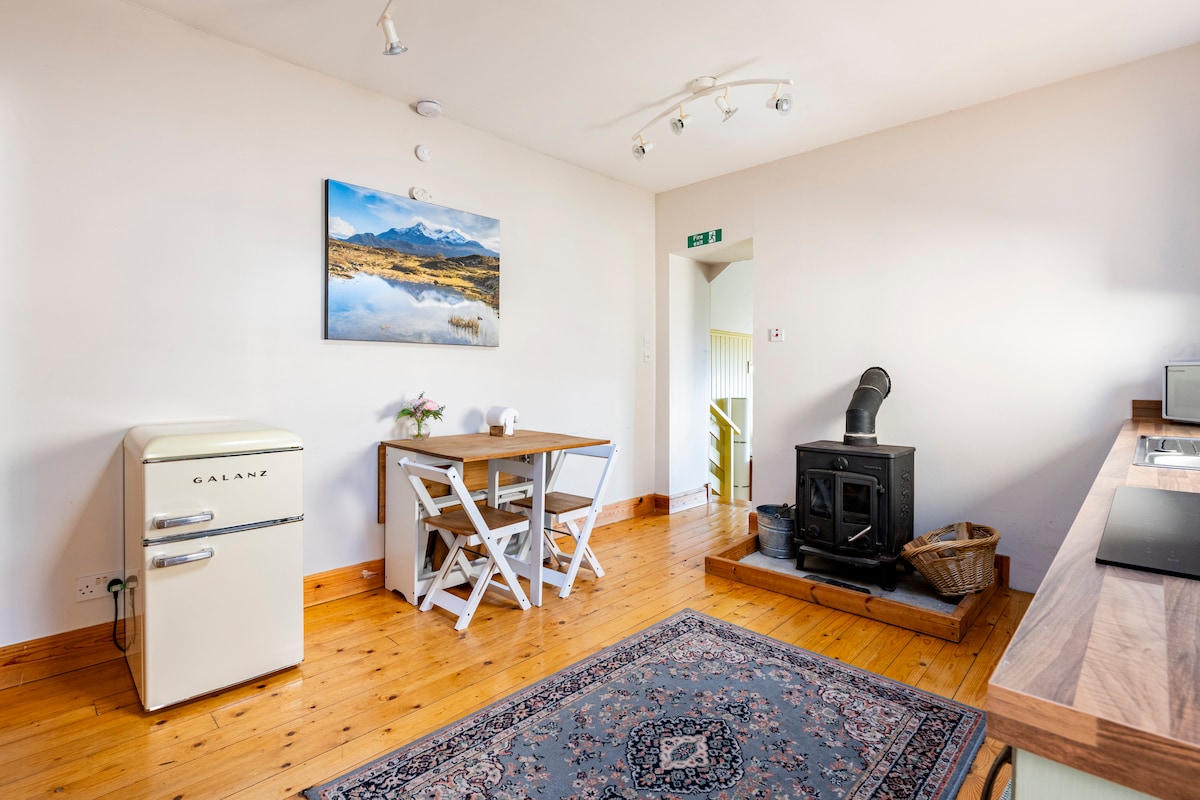 A cosy National Park hide-away surrounded by nature, wildlife and farm animals over the fence. Rustic comfort, ideal for hikers,travellers or remote workers looking for countryside, amazing mountain views and those big Scottish skies. Private location is accessed via a horrible rough farm track! King bedroom and bunkbeds in a tiny bedroom. Comfy corner sofa to relax, outdoor covered seating for star-gazing. Inside the Loch Lomond National Park. Calm, birdsong, walks and traditional pub. 2 desks