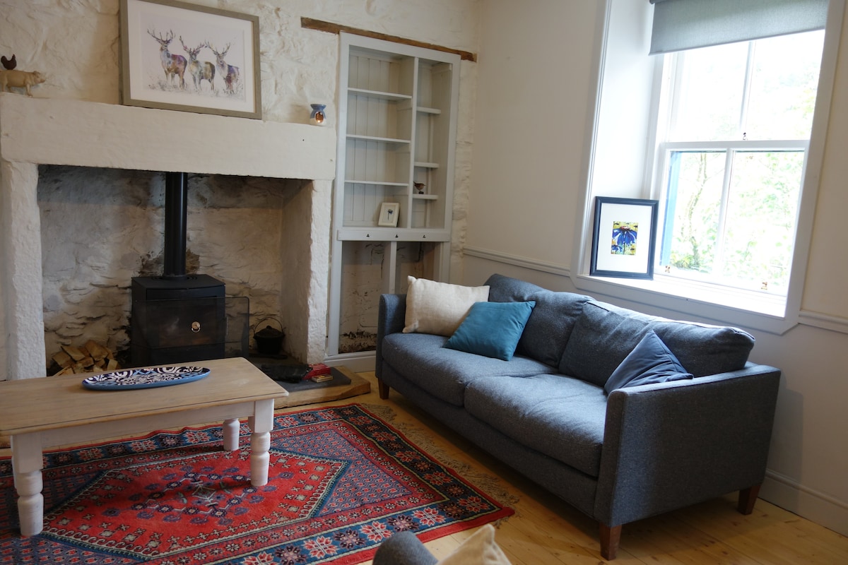A cosy National Park hide-away surrounded by nature, wildlife and farm animals over the fence. Rustic comfort, ideal for hikers,travellers or remote workers looking for countryside, amazing mountain views and those big Scottish skies. Private location is accessed via a horrible rough farm track! King bedroom and bunkbeds in a tiny bedroom. Comfy corner sofa to relax, outdoor covered seating for star-gazing. Inside the Loch Lomond National Park. Calm, birdsong, walks and traditional pub. 2 desks