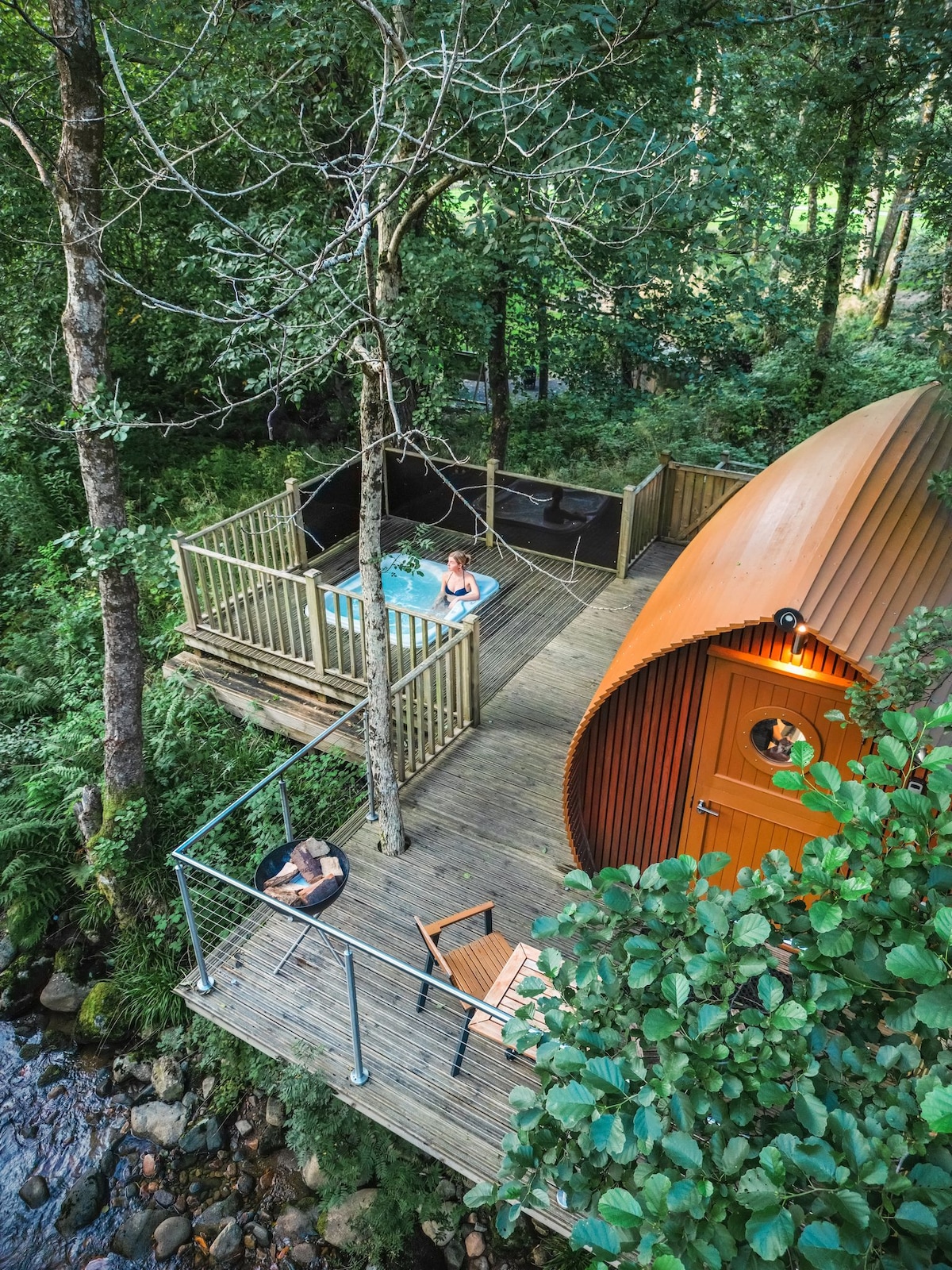 Escape into another world! Accessed via a raised boardwalk and boasting a private veranda that stretches out towards the river, your tiny crafted lodge boasts every luxury! A day enjoying "the outdoor capital of the UK" and an evening of warm bubbles in the private hot tub. To then sink into the best sleep for the year in the deep comfort of our special Duvalay mattress.