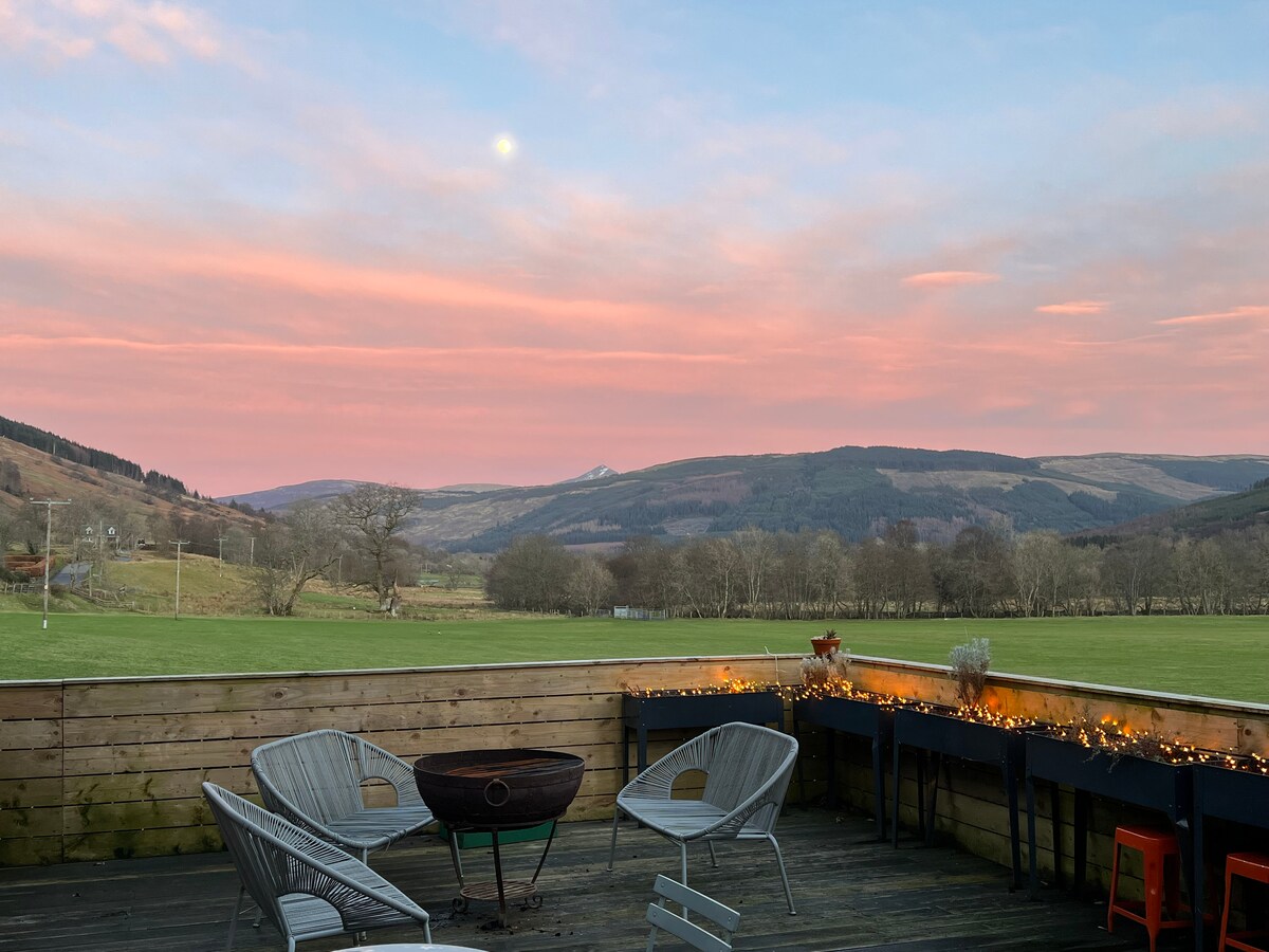 Cois Loch Lodge is a unique lodge situated in a peaceful setting with magnificent views over Loch Lomond and the hills beyond. Nestled at the end of a private road between Drymen and Balmaha, it has its own private parking and enclosed garden. French doors open out onto a fabulous decking area furnished with a table and garden sofas. A few steps down from the deck sits a tastefully furnished Scandinavian BBQ hut. No matter the weather, you can still enjoy a BBQ!