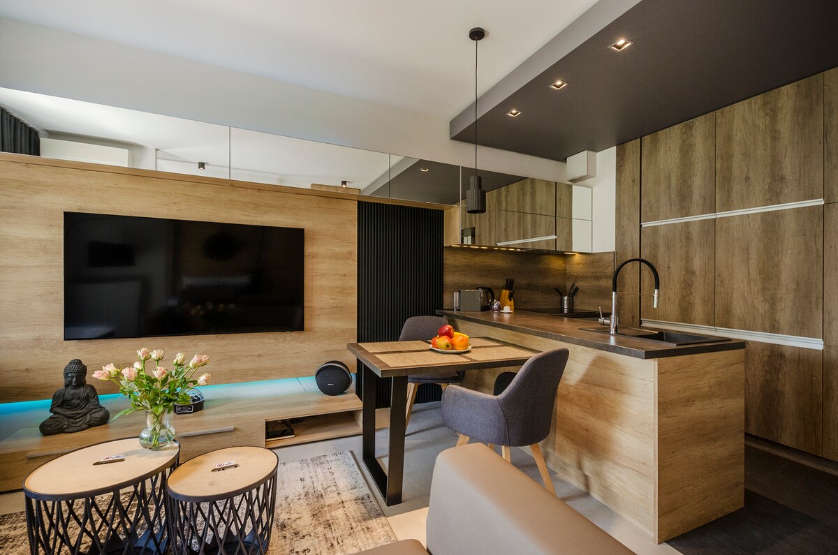 This loft is a unique blend of history and modernity, located in the historic Scheibler factory in the iconic Księży Młyn district. Its industrial design, featuring brick, wood, and stone, creates an unforgettable atmosphere. The spacious interior is fully equipped, with a comfortable king-size bed and panoramic city views ensuring a cozy stay. With restaurants, museums, and Źródliska Park nearby, it’s the perfect place to relax and explore the charm of Łódź.