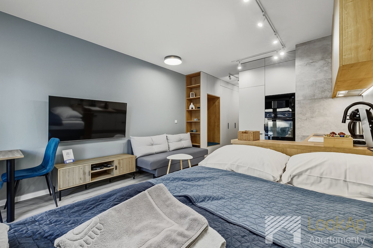 ENG below / Ten apartament to mix wyrafinowania i współczesnego designu / Bezpłatny parking podziemny / Feel of a hotel, convenience of an airbnb / Mieszkanie jest wyposażone na każdą codzienna okoliczność, tak by spełnić wymagania gości przybywających nawet na długie wizyty. W razie potrzeby - komfortowa rozkładana sofa oferuje dodatkowe miejsca do spania. Funkcjonalna, stonowana przestrzeń sprzyja skupieniu podczas biznesowego wyjazdu, jak i relaksowi, kiedy słońce zachodzi nad miastem.