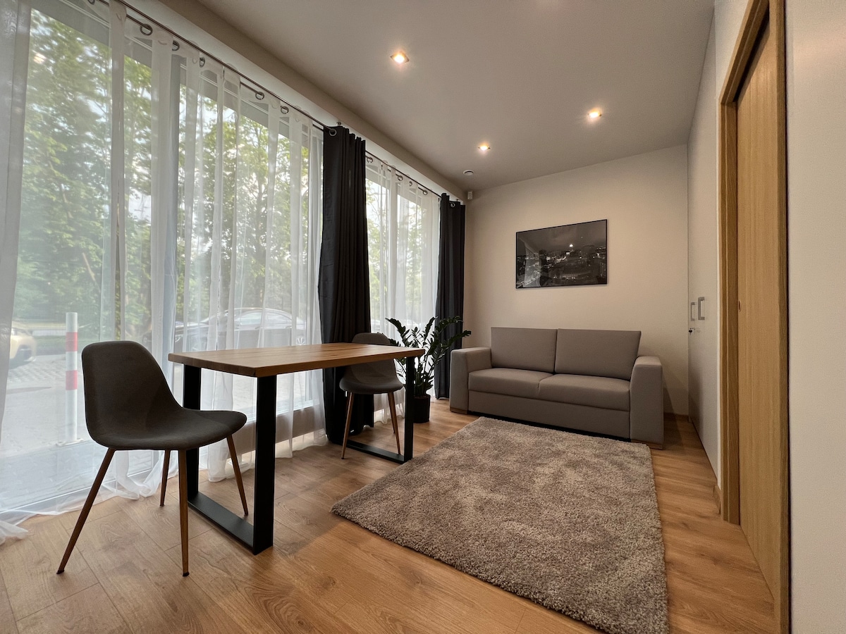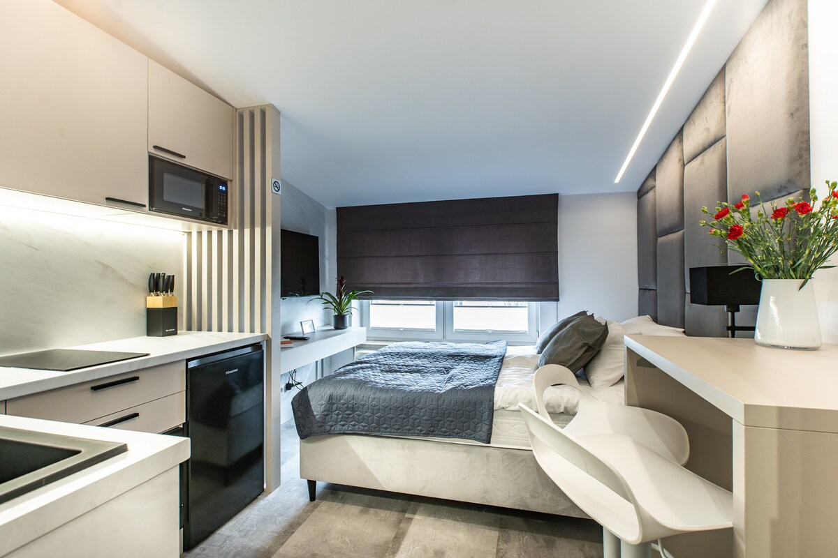 Do dyspozycji Gości jest klimatyzowane studio z telewizorem, pralką, zestawem do parzenia kawy i herbaty. W łazience z prysznicem znajduje się bezpłatny zestaw kosmetyków, ręczniki, suszarka do włosów . W dobrze wyposażonym aneksie kuchennym znajduje się płyta kuchenna, lodówka, zmywarka i przybory kuchenne. Studio jest wyposażone we wszystko, czego potrzeba do komfortowego pobytu. W apartamencie znajdują się łóżko king-size 180 x 200 cm i rozkładana sofą.