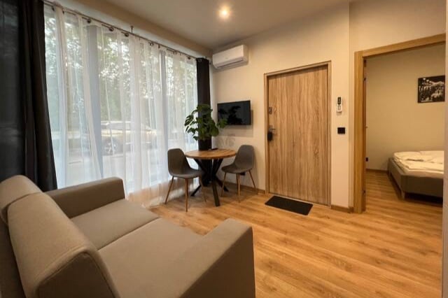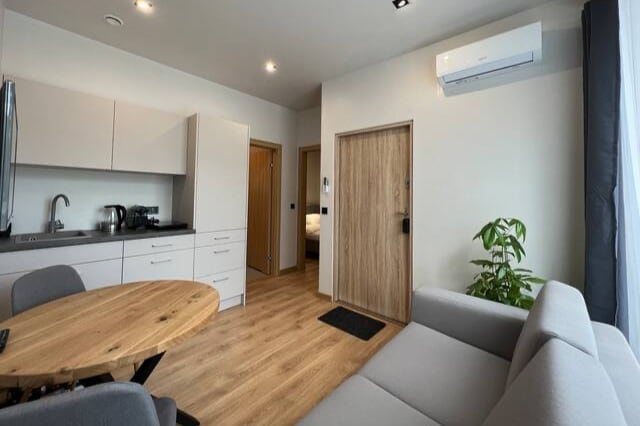 Nasze apartamenty zostały zaprojektowane z dbałością o szczegóły, łącząc nowoczesny styl z funkcjonalnością, aby zapewnić Państwu maksymalny komfort. Każdy apartament składa się z przestronnego salonu z aneksem kuchennym oraz oddzielnej łazienki. Kuchnie są w pełni wyposażone, co umożliwia samodzielne przygotowanie posiłków. Na terenie całego hotelu zapewniamy bezpłatny dostęp do Wi-Fi. Dodatkowo, do dyspozycji Gości jest pralnia znajdująca się w budynku.